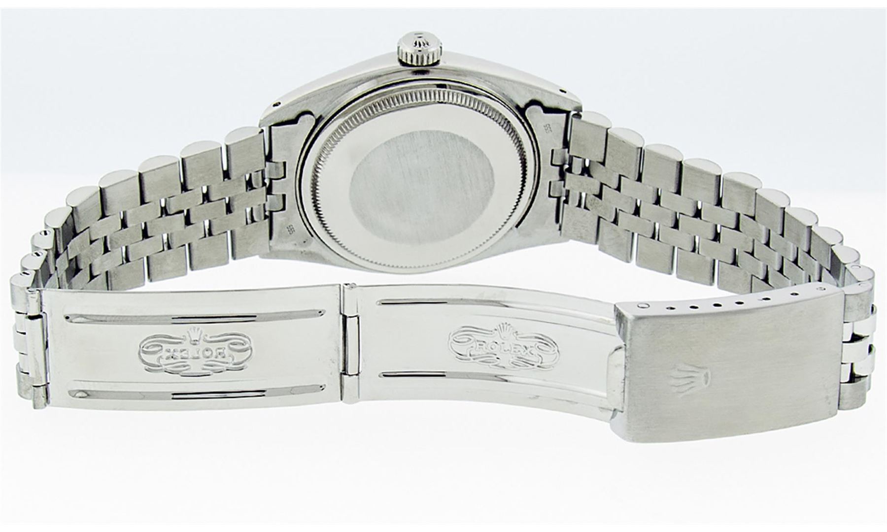 One Gents Rolex Datejust Polished Bright with Satin Finish, Serviced & Electronically Tested, Stainless Steel Case: 36mm, Stainless Steel Crown, Bezel: 14K White Gold Fluted Bezel. Custom Crystal: Acrylic Cyclops Lens. Movement: Automatic Winding Movement Caliber 3035. Custom Dial: Mother Of Pearl Sapphire String Diamond Dial, Stone Count: 10 Sapphires + 48 Diamond in Dial G To H In Color, SI-VS Clarity. Date Window: 3 O'Clock Position Date Display, Quickset, Model: Datejust, Condition: G-6 Extra Fine. Bracelet: Stainless Steel Jubilee. Bright Polish & Satin Finish. 7.0 Inch Length, Adjustable. Standard Clasp, With Rolex Logo.