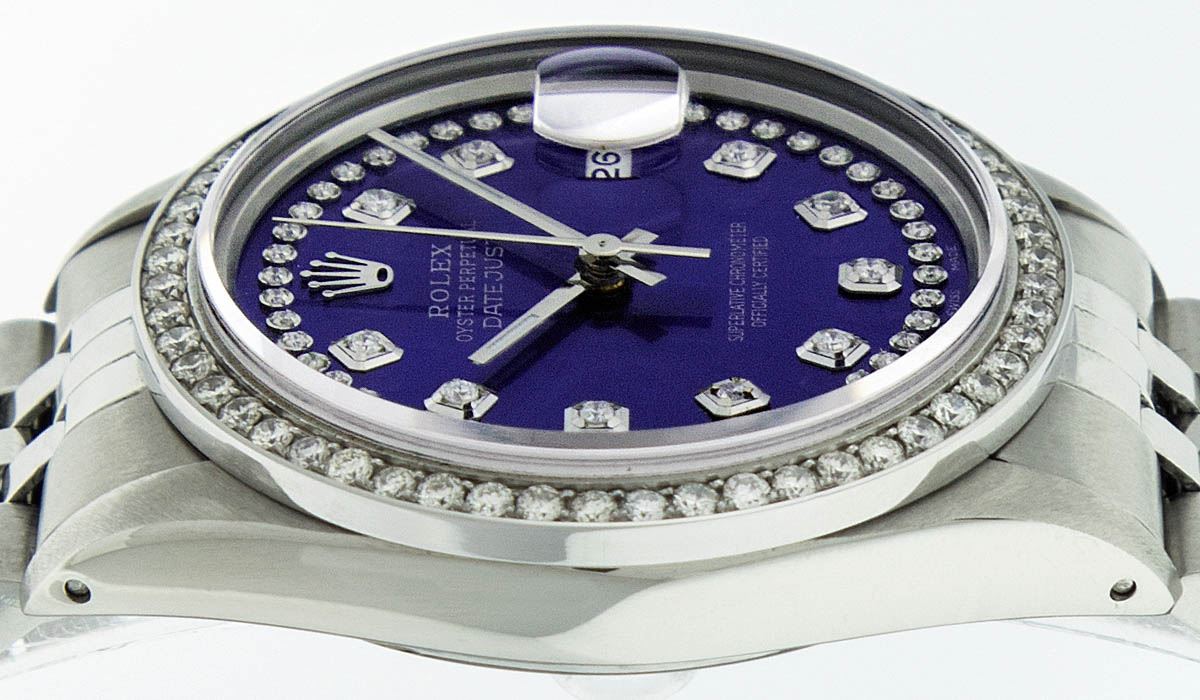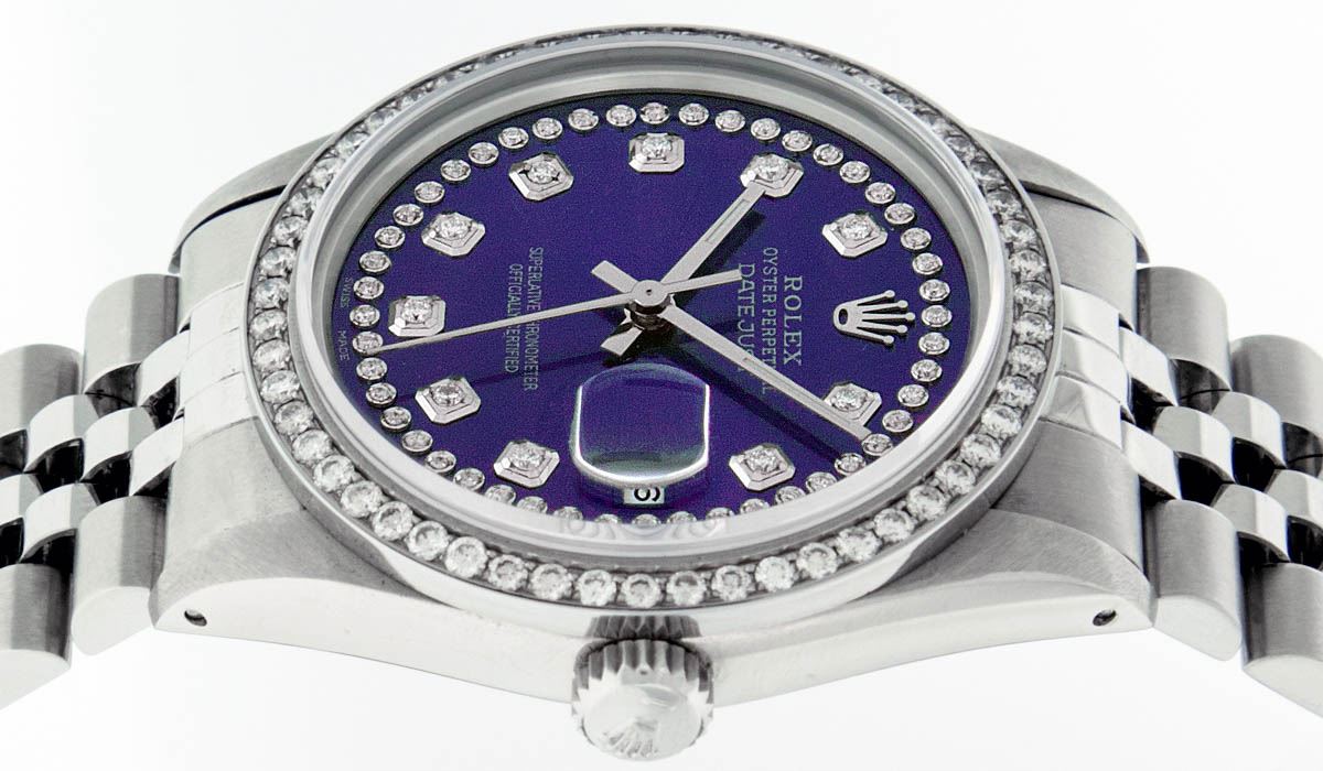 One Mens Rolex Datejust Polished Bright with Satin Finish, Serviced & Electronically Tested, Stainless Steel Case:36mm, Stainless Steel Crown, Custom Bezel: Stainless Steel Beadset Diamond Bezel, Diamond Count: 54 Diamonds Total Weight 1.00 Carat, Clarity: SI-VS, Color: G to H. Custom Crystal: Synthetic Sapphire Cyclops Lens. Movement: Automatic Winding Movement Caliber 3035. Custom Dial: Purple String Diamond Dial, Diamond Count: 58 Diamonds In Dial, Color: G to H, Clarity: VS2-SI1. Date Window: 3 O'Clock Position Date Display, Quickset, Model: Datejust. Condition: G-6 Extra Fine. Bracelet:Stainless Steel Jubilee Band. Bright Polish & Satin Finish. 7.0 Inch Length, Adjustable. Standard Clasp, With Rolex Logo. This watch has been serviced time tested and is in excellent condition it is free of all scratches and dents.