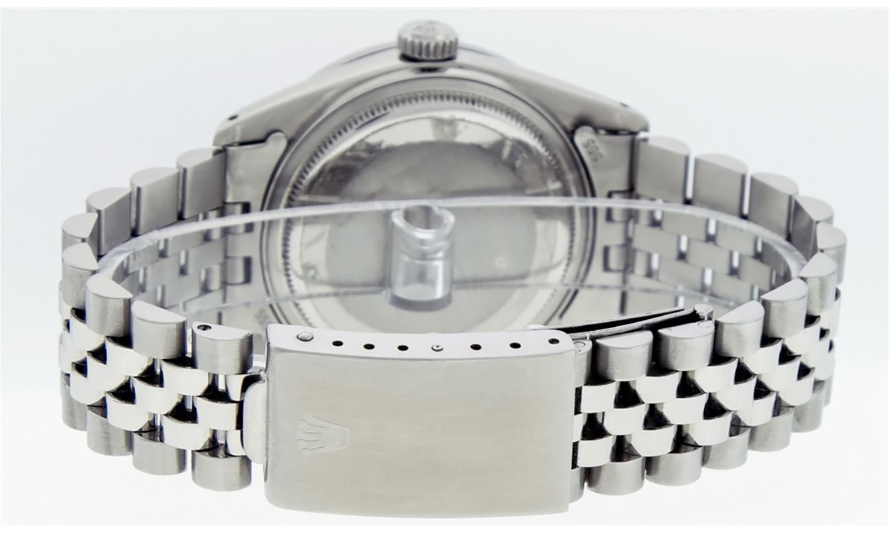 One Mens Rolex Datejust Polished Bright with Satin Finish, Serviced & Electronically Tested, Stainless Steel Case:36mm, Stainless Steel Crown, Custom Bezel: Stainless Steel Beadset Diamond Bezel, Diamond Count: 54 Diamonds Total Weight 1.00 Carat, Clarity: SI-VS, Color: G to H. Custom Crystal: Synthetic Sapphire Cyclops Lens. Movement: Automatic Winding Movement Caliber 3035. Custom Dial: Purple String Diamond Dial, Diamond Count: 58 Diamonds In Dial, Color: G to H, Clarity: VS2-SI1. Date Window: 3 O'Clock Position Date Display, Quickset, Model: Datejust. Condition: G-6 Extra Fine. Bracelet: Stainless Steel Jubilee Band. Bright Polish & Satin Finish. 7.0 Inch Length, Adjustable. Standard Clasp, With Rolex Logo. This watch has been serviced time tested and is in excellent condition it is free of all scratches and dents.