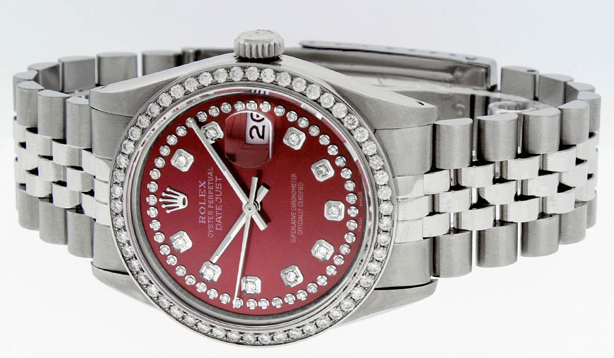 One Mens Rolex Datejust Polished Bright with Satin Finish, Serviced & Electronically Tested, Stainless Steel Case:36mm, Stainless Steel Crown, Custom Bezel: Stainless Steel Beadset Diamond Bezel, Diamond Count: 54 Diamonds Total Weight 1.00 Carat, Clarity: SI-VS, Color: G to H. Custom Crystal: Synthetic Sapphire Cyclops Lens. Movement: Automatic Winding Movement Caliber 3035. Custom Dial: Red String Diamond Dial, Diamond Count: 58 Diamonds In Dial, Color: G to H, Clarity: VS2-SI1. Date Window: 3 O'Clock Position Date Display, Quickset, Model: Datejust. Condition: G-6 Extra Fine. Bracelet:Stainless Steel Jubilee. Bright Polish & Satin Finish. 7.0 Inch Length, Adjustable. Standard Clasp, With Rolex Logo. This watch has been serviced time tested and is in excellent condition it is free of all scratches and dents.