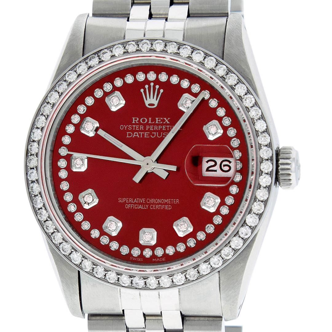 One Mens Rolex Datejust Polished Bright with Satin Finish, Serviced & Electronically Tested, Stainless Steel Case:36mm, Stainless Steel Crown, Custom Bezel: Stainless Steel Beadset Diamond Bezel, Diamond Count: 54 Diamonds Total Weight 1.00 Carat, Clarity: SI-VS, Color: G to H. Custom Crystal: Synthetic Sapphire Cyclops Lens. Movement: Automatic Winding Movement Caliber 3035. Custom Dial: Red String Diamond Dial, Diamond Count: 58 Diamonds In Dial, Color: G to H, Clarity: VS2-SI1. Date Window: 3 O'Clock Position Date Display, Quickset, Model: Datejust. Condition: G-6 Extra Fine. Bracelet:Stainless Steel Jubilee. Bright Polish & Satin Finish. 7.0 Inch Length, Adjustable. Standard Clasp, With Rolex Logo. This watch has been serviced time tested and is in excellent condition it is free of all scratches and dents.