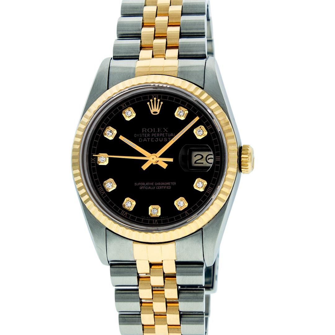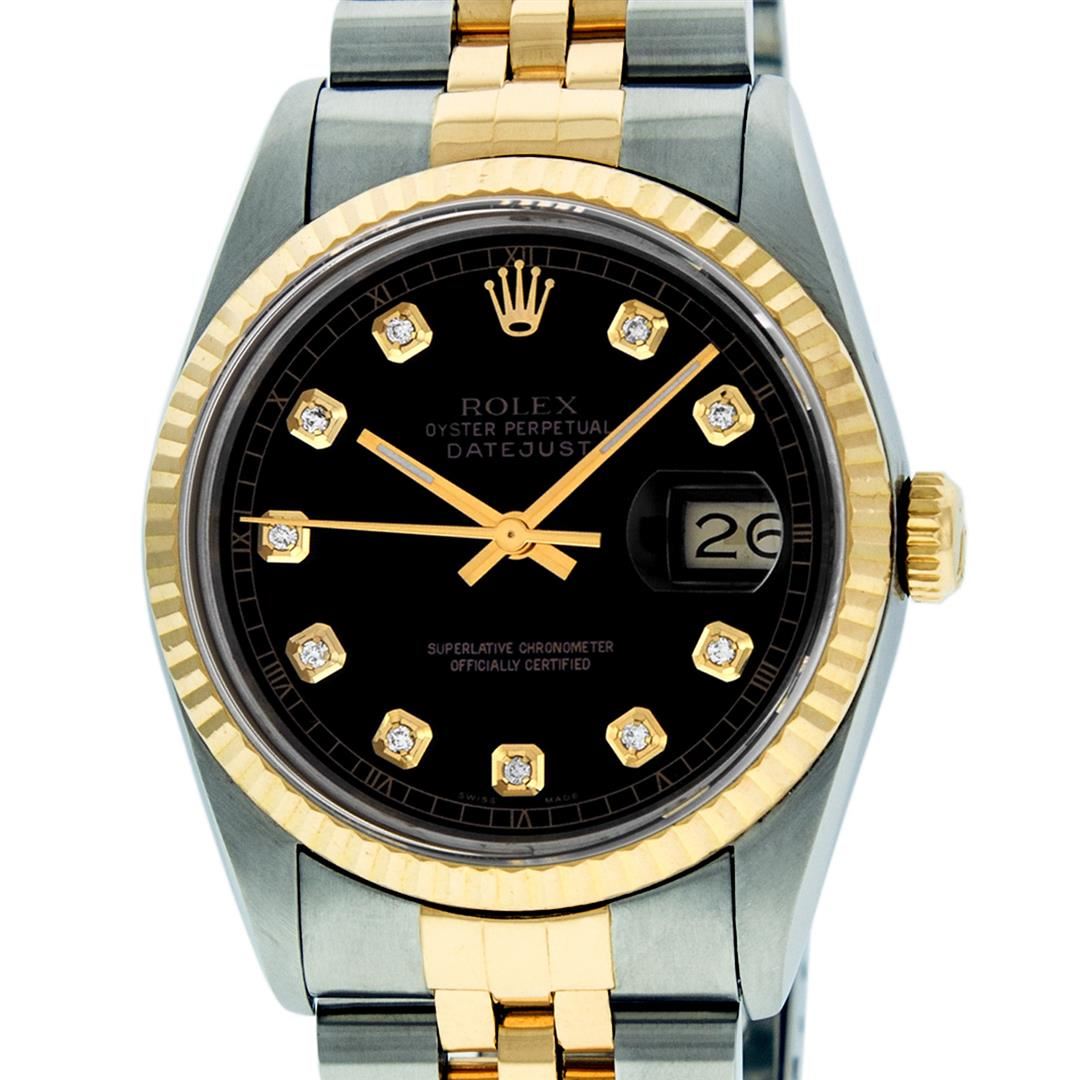 One Gents Two Tone Rolex Datejust Polished, Serviced & Electronically Tested, 14K Yellow Gold & Stainless Steel Case: 36mm, 14K Yellow Gold Crown, Bezel: 18K Yellow Gold Fluted Bezel. Custom Crystal: Acrylic Cyclops Lens. Movement: Automatic Winding Movement Caliber 3035. Custom Dial: Black Dial Set With Diamond Hour Markers And Square Roman Track, Diamond Count: 10 Diamonds in Dial G To H In Color, SI-VS Clarity. Date Window: 3 O'Clock Position Date Display, Quickset, Model: 16013 Condition: G-6 Extra Fine. Bracelet: Two Tone 14K Yellow Gold & Stainless Steel Jubilee. Bright Polish. 7.0 Inch Length, Adjustable. Standard Clasp, With Rolex Logo. Watch Has Been Serviced And Polished It Is Free Of All Scratches And Dents.