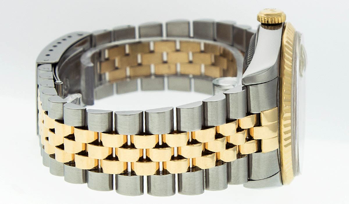 One Gents Two Tone Rolex Datejust Polished, Serviced & Electronically Tested, 14K Yellow Gold & Stainless Steel Case: 36mm, 14K Yellow Gold Crown, Bezel: 18K Yellow Gold Fluted Bezel. Custom Crystal: Acrylic Cyclops Lens. Movement: Automatic Winding Movement Caliber 3035. Dial: Champagne Index With Lumi Dots And Line Track. Date Window: 3 O'Clock Position Date Display, Quickset, Model: 16013 Condition: G-6 Extra Fine. Bracelet:Two Tone 14K Yellow Gold & Stainless Steel Jubilee. Bright Polish. 7.0 Inch Length, Adjustable. Standard Clasp, With Rolex Logo. Watch Has Been Serviced And Polished It Is Free Of All Scratches And Dents.