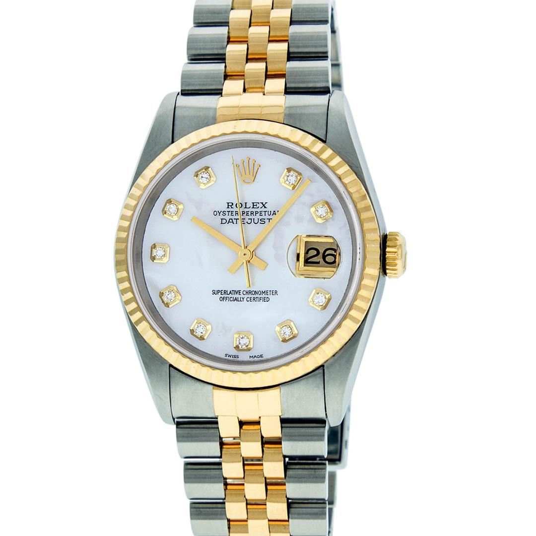One Gents Two Tone Rolex Datejust Polished, Serviced & Electronically Tested, 14K Yellow Gold & Stainless Steel Case: 36mm, 14K Yellow Gold Crown, Bezel: 18K Yellow Gold Fluted Bezel. Custom Crystal: Acrylic Cyclops Lens. Movement: Automatic Winding Movement Caliber 3035. Custom Dial: Mother Of Pearl Dial Set With Diamond Hour Markers, Diamond Count: 10 Diamonds in Dial G To H In Color, Si-VS Clarity. Date Window: 3 O'Clock Position Date Display, Quickset, Model: 16013 Condition: G-6 Extra Fine. Bracelet:Two Tone 14K Yellow Gold & Stainless Steel Jubilee. Bright Polish. 7.0 Inch Length, Adjustable. Standard Clasp, With Rolex Logo. Watch Has Been Serviced And Polished It Is Free Of All Scratches And Dents.