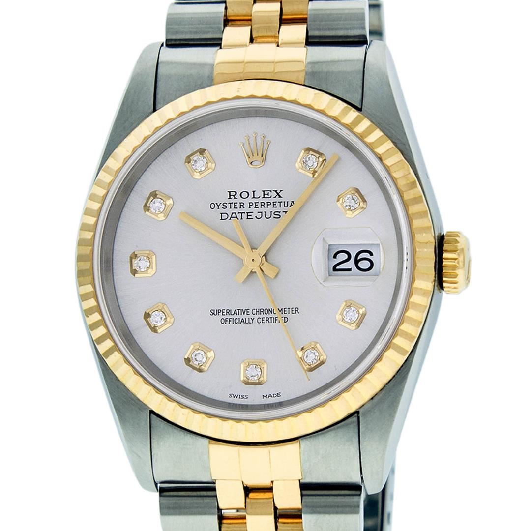 One Gents Two Tone Rolex Datejust Polished, Serviced & Electronically Tested, 14K Yellow Gold & Stainless Steel Case: 36mm, 14K Yellow Gold Crown, Bezel: 18K Yellow Gold Fluted Bezel. Custom Crystal: Acrylic Cyclops Lens. Movement: Automatic Winding Movement Caliber 3035. Custom Dial: Silver Dial Set With Diamond Hour Markers, Diamond Count: 10 Diamonds in Dial G To H In Color, Si-VS Clarity. Date Window: 3 O'Clock Position Date Display, Quickset, Model: 16013 Condition: G-6 Extra Fine. Bracelet:Two Tone 14K Yellow Gold & Stainless Steel Jubilee. Bright Polish. 7.0 Inch Length, Adjustable. Standard Clasp, With Rolex Logo. Watch Has Been Serviced And Polished It Is Free Of All Scratches And Dents.