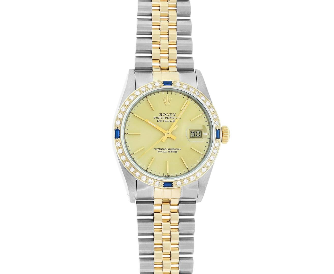 One Mens Rolex Quickset Pre Owned Two Tone 14K Yellow Gold And Stainless Steel Datejust Polished, Serviced & Electronically Tested, Rolex Yellow Gold & Stainless Steel Case: 36mm, Rolex 14K Yellow Gold Crown, Custom Bezel: New 18K Yellow Diamond + Sapphire Beadset Bezel, Stone Count: 36 Diamonds + 4 Sapphires, Total Weight.75 Carat, Clarity: SI-VS, Color: G to H. Custom Crystal: New Sapphire With Magnified Date Window. Custom Hands: New Luminecent Hands. Rolex Movement: Automatic Winding Movement 3035. Rolex Dial: Champagne Dial With Index Hour Markers Dash Track And Lumi Dots. Date Window: 3 O'Clock Position Date Display, Quickset, Model: Datejust. Condition: G-6 Extra Fine. Rolex Bracelet: Two Tone 14K Yellow Gold & Stainless Steel Jubilee Band. Bright Polish. 7.0 Inch Length, Adjustable. Standard Clasp, With Rolex Logo. This Watch Has Been Serviced Time Tested And Is In Excellent Condition It Is Free Of All Scratches And Dents.