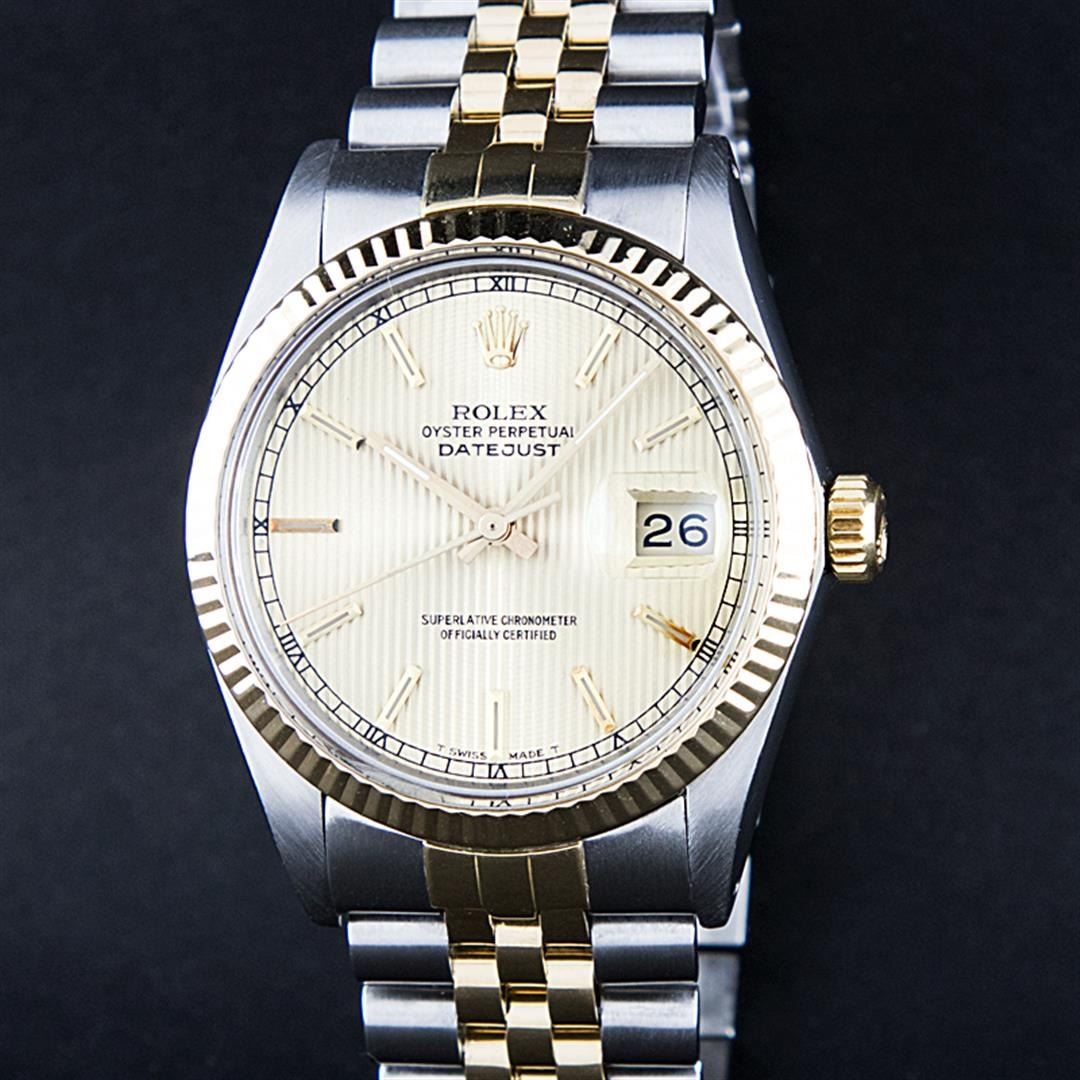 One Mens Rolex Pre Owned 14K Two Tone Yellow Gold And Stainless Steel Datejust Polished, Serviced & Electronically Tested, Rolex Yellow Gold & Stainless Steel Case: 36mm, Rolex Yellow Gold Crown, Rolex Bezel: 14K Yellow Gold Fluted Bezel. Custom Crystal: New Acrylic With Magnified Date Window. Custom Hands: New Luminescent Hands. Rolex Movement: Automatic Winding Movement 3035. Rolex Dial: Champagne Tapestry Index Dial With Roman Square Track. Date Window: 3 O'Clock Position Date Display, Quickset, Model: Datejust. Condition: G-6 Extra Fine. Rolex Bracelet: Two Tone 14K Yellow Gold & Stainless Steel Jubilee Band. Bright Polish. 7.0 Inch Length, Adjustable. Standard Clasp, With Rolex Logo. This Watch Has Been Serviced Time Tested And Is In Excellent Condition It Is Free Of All Scratches And Dents.