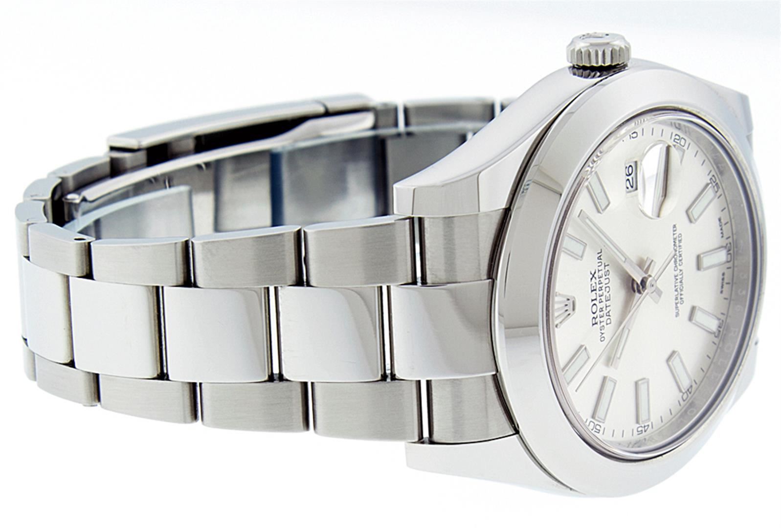 One Mens Rolex Datejust 2 41MM Polished, Serviced & Electronically Tested, Rolex Stainless Steel Case: 41mm, Stainless Steel Crown, Rolex Bezel: Stainless Steel Smooth Bezel, Crystal: Sapphire With Magnified Date Window. Hands: Luminescent Hands. Rolex Movement: Automatic Winding Movement 3136. Rolex Dial: White Index With Dash Track. Date Window: 3 O'Clock Position Date Display, Quickset, Model: Datejust 2. Condition: G-6 Extra Fine. Rolex Bracelet: Stainless Steel Oyster Band. Bright Polish & Satin Finish. 7.0 Inch Length, Adjustable. Standard Clasp, With Rolex Logo. This Pre Owned Watch Has Been Serviced Time Tested And Is In Excellent Condition It Is Free Of All Scratches And Dents.