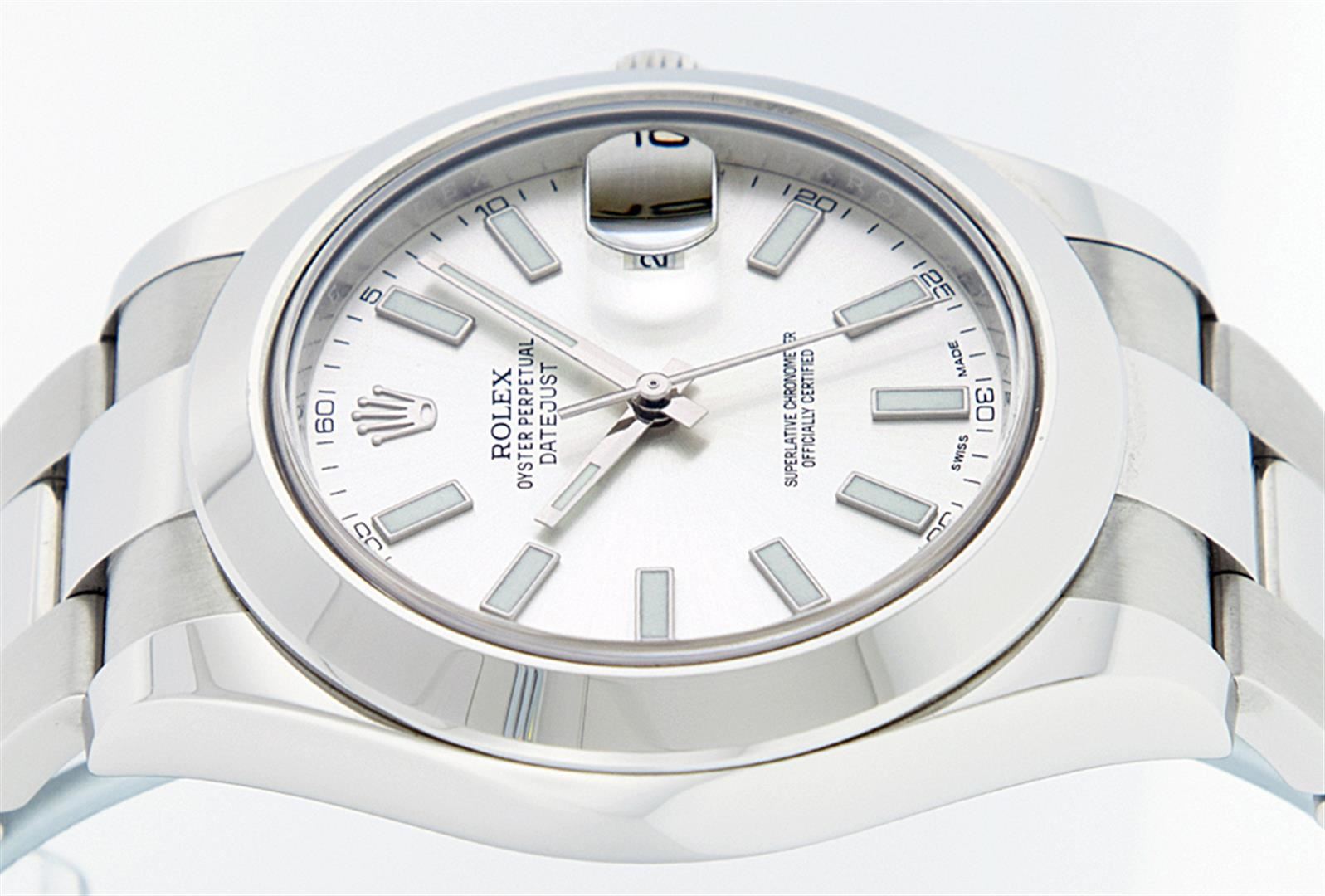 One Mens Rolex Datejust 2 41MM Polished, Serviced & Electronically Tested, Rolex Stainless Steel Case: 41mm, Stainless Steel Crown, Rolex Bezel: Stainless Steel Smooth Bezel, Crystal: Sapphire With Magnified Date Window. Hands: Luminescent Hands. Rolex Movement: Automatic Winding Movement 3136. Rolex Dial: White Index With Dash Track. Date Window: 3 O'Clock Position Date Display, Quickset, Model: Datejust 2. Condition: G-6 Extra Fine. Rolex Bracelet: Stainless Steel Oyster Band. Bright Polish & Satin Finish. 7.0 Inch Length, Adjustable. Standard Clasp, With Rolex Logo. This Pre Owned Watch Has Been Serviced Time Tested And Is In Excellent Condition It Is Free Of All Scratches And Dents.