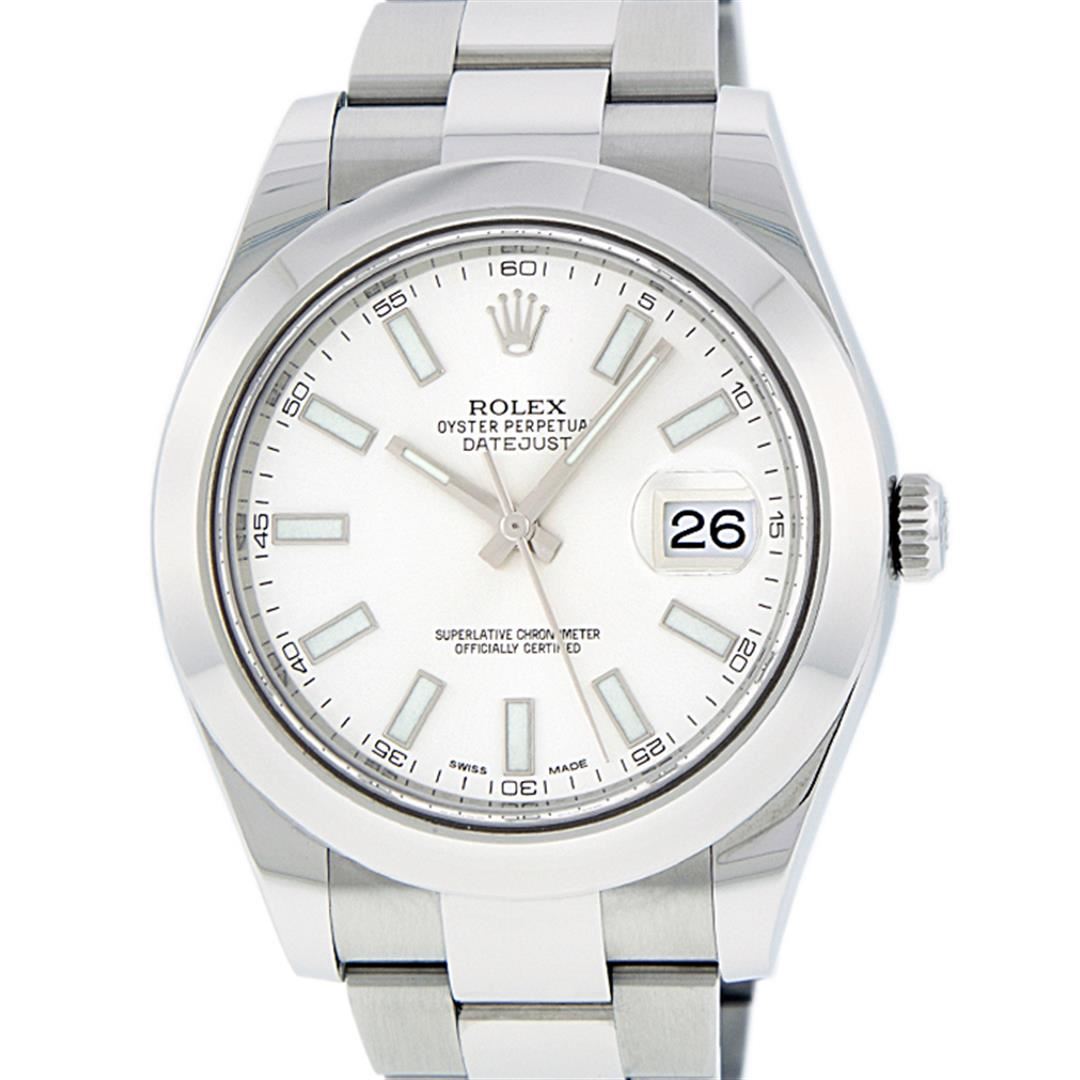 One Mens Rolex Datejust 2 41MM Polished, Serviced & Electronically Tested, Rolex Stainless Steel Case: 41mm, Stainless Steel Crown, Rolex Bezel: Stainless Steel Smooth Bezel, Crystal: Sapphire With Magnified Date Window. Hands: Luminescent Hands. Rolex Movement: Automatic Winding Movement 3136. Rolex Dial: White Index With Dash Track. Date Window: 3 O'Clock Position Date Display, Quickset, Model: Datejust 2. Condition: G-6 Extra Fine. Rolex Bracelet: Stainless Steel Oyster Band. Bright Polish & Satin Finish. 7.0 Inch Length, Adjustable. Standard Clasp, With Rolex Logo. This Pre Owned Watch Has Been Serviced Time Tested And Is In Excellent Condition It Is Free Of All Scratches And Dents.