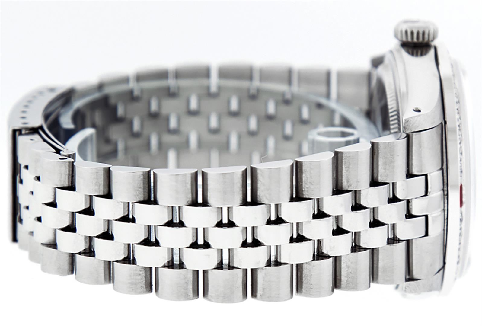 One Mens Pre Owned Stainless Steel Rolex Datejust Polished, Serviced & Electronically Tested, Rolex Stainless Steel Case: 36mm, Rolex Stainless Steel Crown, Custom Bezel: New 18K White Gold Rubies Beadset Diamond Bezel, Diamond + Gem Count: 36 Diamonds + 4 Rubies, Clarity: SI-VS, Color: G to H. Custom Crystal: New Sapphire With Date Window. Custom Hands: New Luminescent Hands. Rolex Movement: Automatic Winding Movement. Custom Dial: Refinished To Black With Custom Added Diamonds, 10 Diamonds in Dial, G To H In Color, Clarity: SI-VS. Date Window: 3 O'Clock Position Date Display, Quickset, Model: Datejust. Condition: G-6 Extra Fine. Rolex Bracelet: Stainless Steel Jubilee Band. Bright Polish & Satin Finish. 7.0 Inch Length, Adjustable. Standard Clasp, With Rolex Logo. This Watch Has Been Serviced Time Tested And Is In Excellent Condition It Is Free Of All Scratches And Dents.
