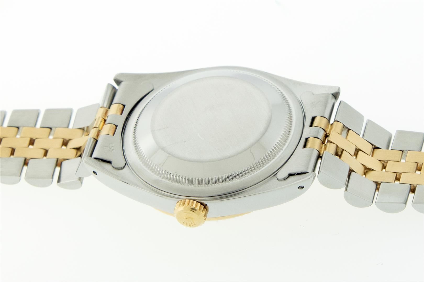 One Mens Pre Owned Yellow Gold Two Tone Rolex Datejust Polished, Serviced & Electronically Tested, Rolex Yellow Gold & Stainless Steel Case: 36mm, Rolex Yellow Gold Crown, Rolex Bezel: Yellow Gold Fluted Bezel. Custom Crystal: New Plastic With Magnified Date Window. Custom Hands: New Luminecent Hands. Rolex Movement: Automatic Winding Movement. Rolex Dial: Champagne Linen Dial With Index Hour Markers and Small Track With Lumi Dots. Date Window: 3 O'Clock Position Date Display, Quickset, Model: Datejust. Condition: G-6 Extra Fine. Rolex Bracelet: Two Tone Yellow Gold & Stainless Steel Jubilee Band. Bright Polish. 7.0 Inch Length, Adjustable. Standard Clasp, With Rolex Logo. This Watch Has Been Serviced Time Tested And Is In Excellent Condition It Is Free Of All Scratches And Dents.