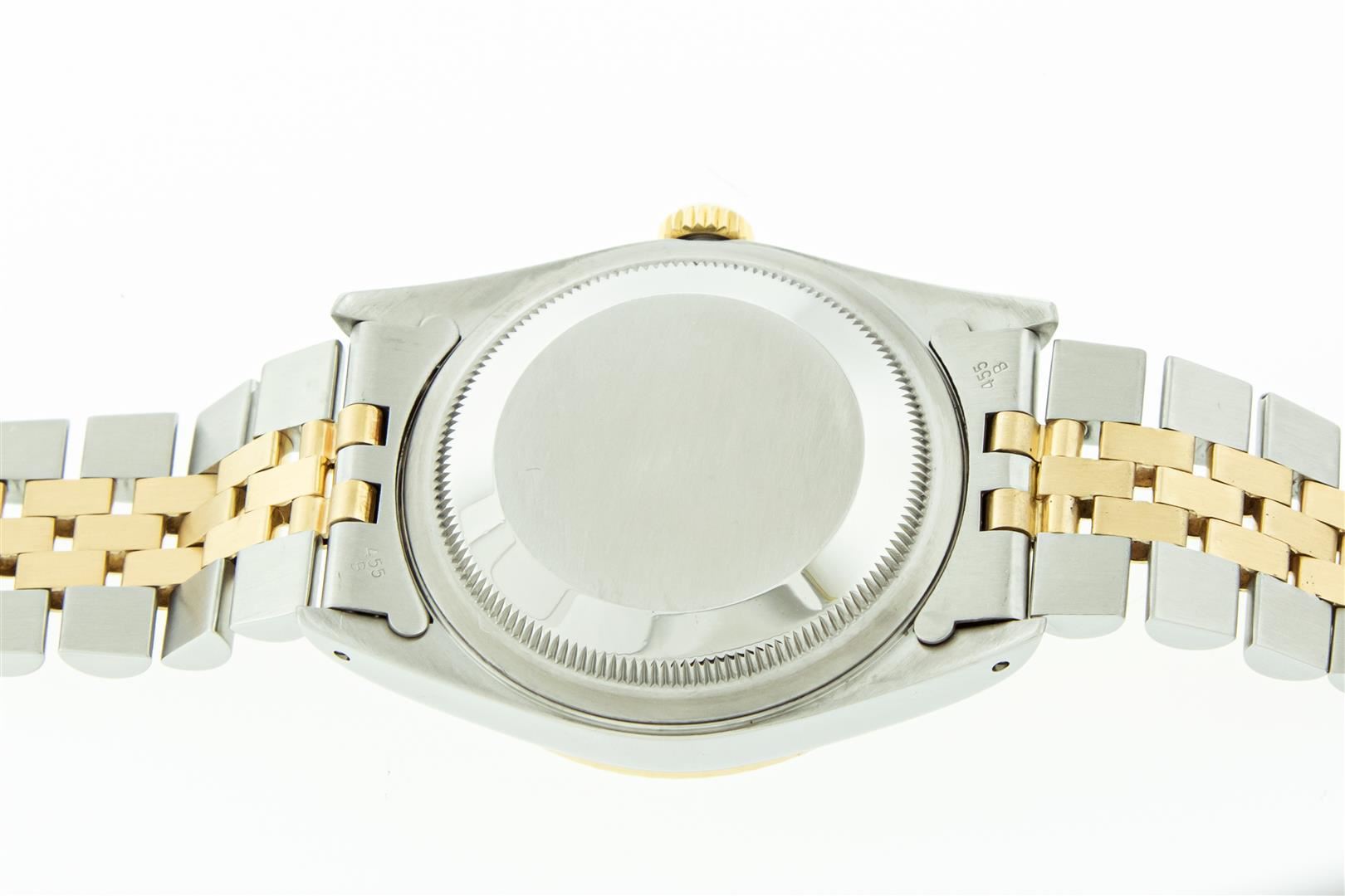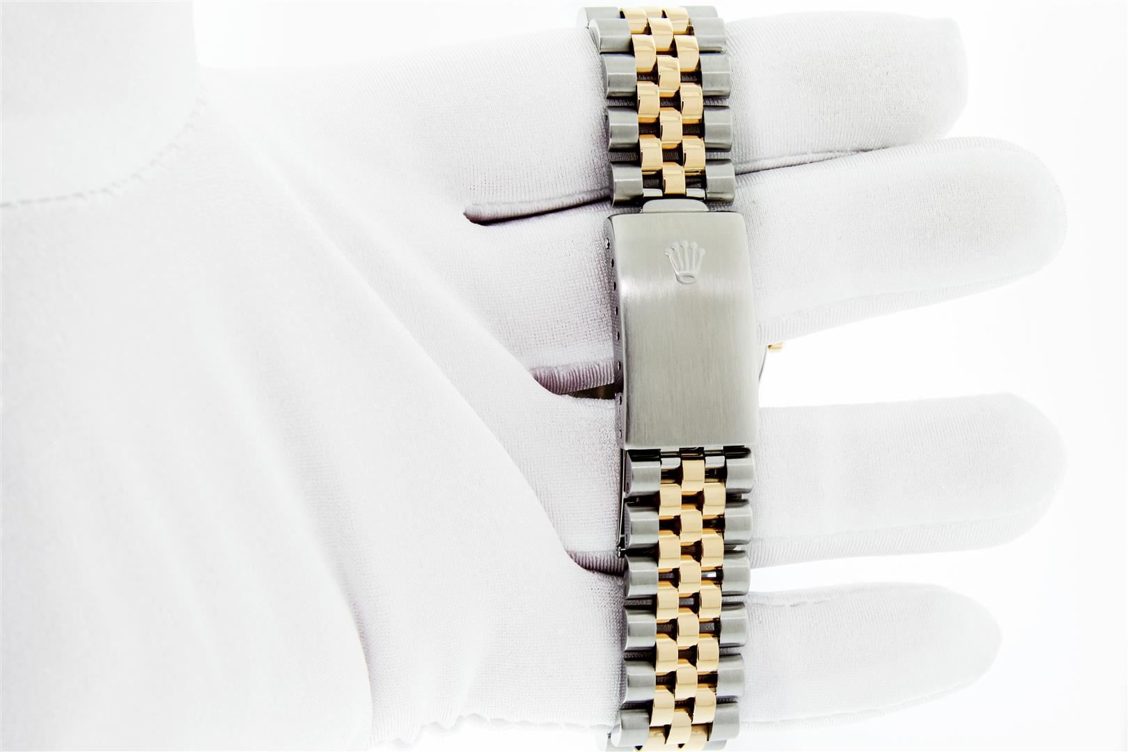 One Mens Pre Owned Yellow Gold Two Tone Rolex Datejust Polished, Serviced & Electronically Tested, Rolex Yellow Gold & Stainless Steel Case: 36mm, Rolex Yellow Gold Crown, Rolex Bezel: Yellow Gold Fluted Bezel. Custom Crystal: New Acrylic Cyclops Lens. Custom Hands: New Luminecent Hands. Rolex Movement: Automatic Winding Movement. Rolex Dial: Silver Dial With Index Hour Markers and Small Track With Lumi Dots. Date Window: 3 O'Clock Position Date Display, Quickset, Model: Datejust. Condition: G-6 Extra Fine. Rolex Bracelet: Two Tone Yellow Gold & Stainless Steel Jubilee Band. Bright Polish. 7.0 Inch Length, Adjustable. Standard Clasp, With Rolex Logo. This Watch Has Been Serviced Time Tested And Is In Excellent Condition It Is Free Of All Scratches And Dents. This Watch Comes With A Rolex Box And Booklets.