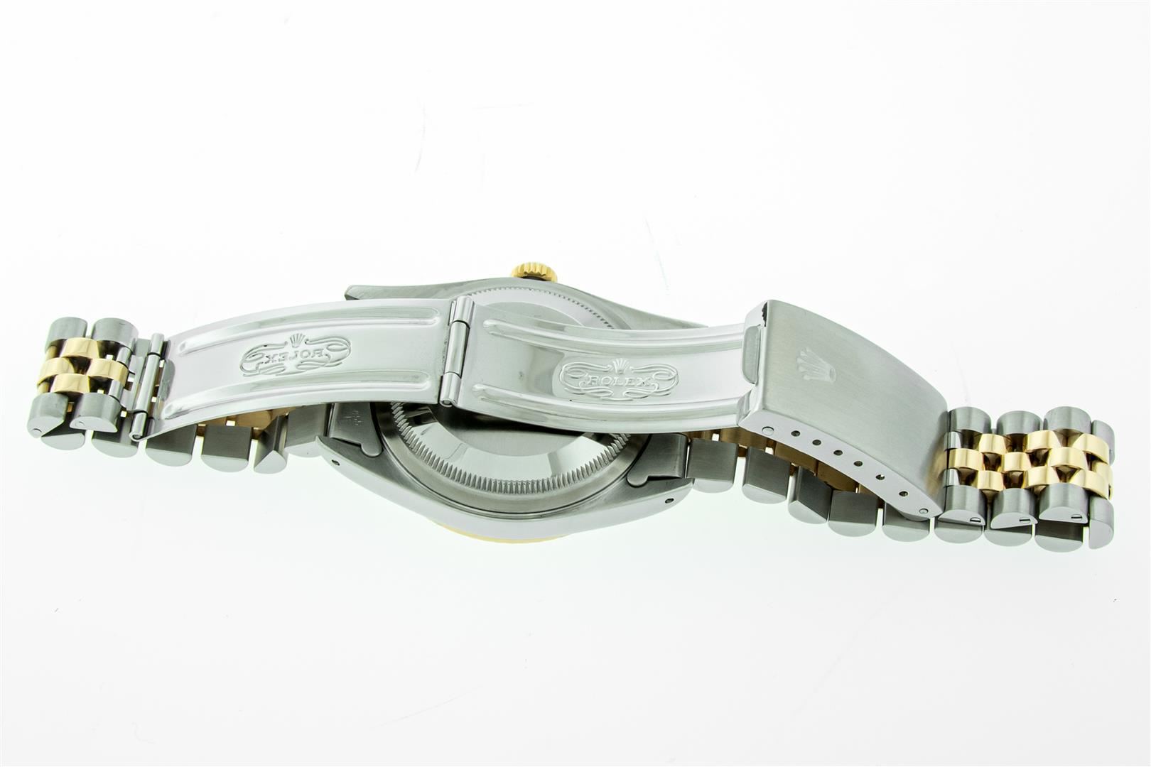 One Mens Pre Owned Yellow Gold Two Tone Rolex Datejust Polished, Serviced & Electronically Tested, Rolex Yellow Gold & Stainless Steel Case: 36mm, Rolex Yellow Gold Crown, Rolex Bezel: Yellow Gold Fluted Bezel. Custom Crystal: New Acrylic Cyclops Lens. Custom Hands: New Luminecent Hands. Rolex Movement: Automatic Winding Movement. Rolex Dial: Silver Dial With Index Hour Markers and Small Track With Lumi Dots. Date Window: 3 O'Clock Position Date Display, Quickset, Model: Datejust. Condition: G-6 Extra Fine. Rolex Bracelet: Two Tone Yellow Gold & Stainless Steel Jubilee Band. Bright Polish. 7.0 Inch Length, Adjustable. Standard Clasp, With Rolex Logo. This Watch Has Been Serviced Time Tested And Is In Excellent Condition It Is Free Of All Scratches And Dents. This Watch Comes With A Rolex Box And Booklets.