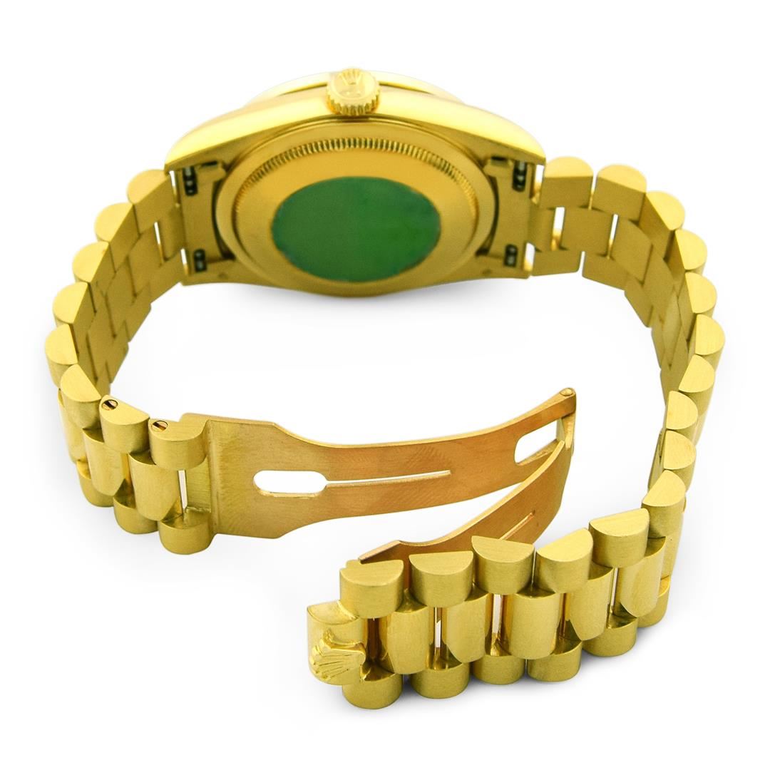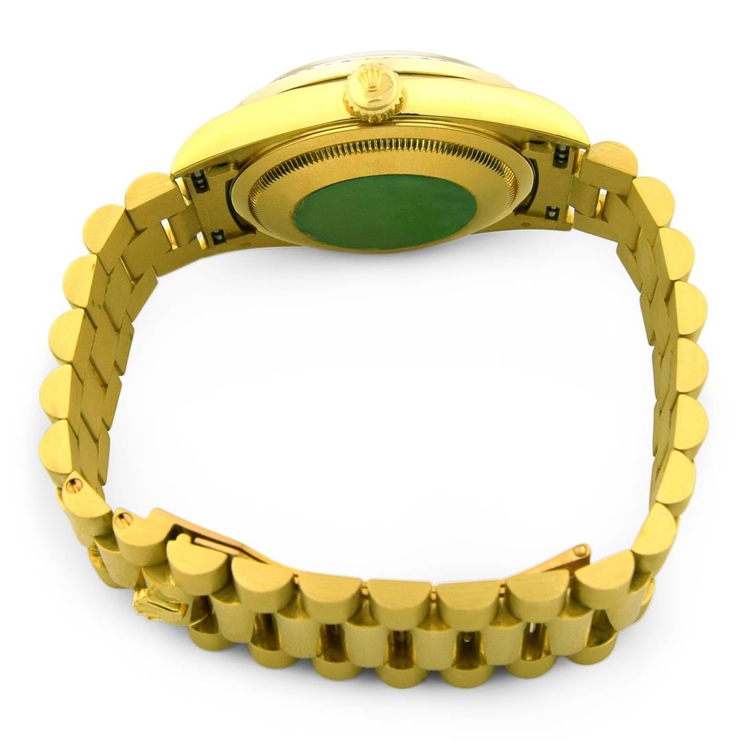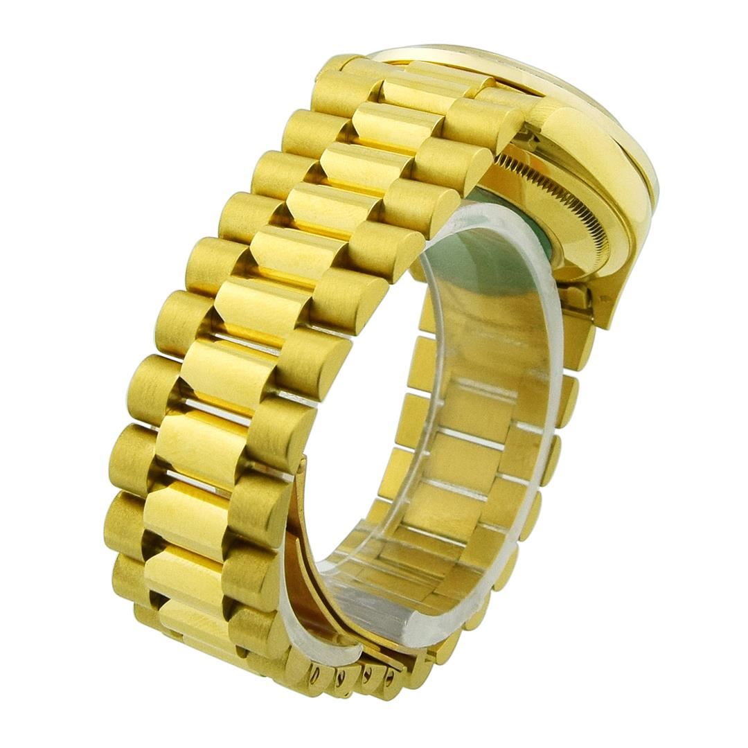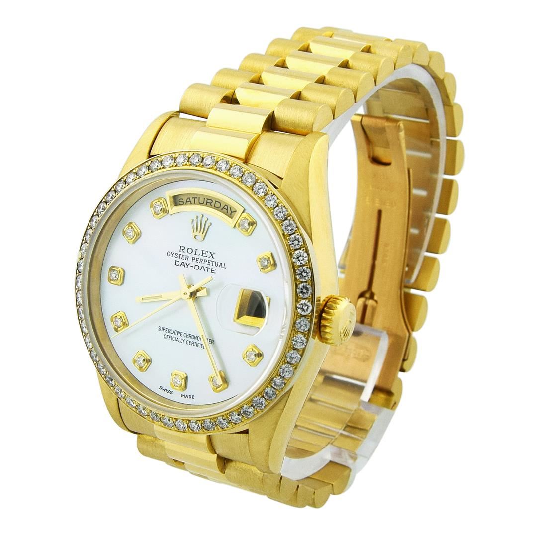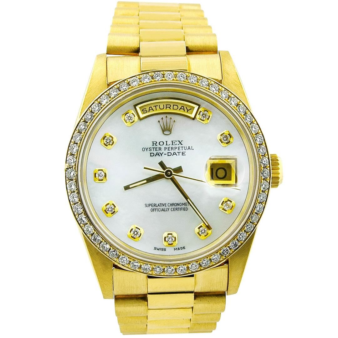 Rolex Unisex Day-Date President 18KT Yellow Gold 36mm Mother of Pearl Diamond Dial Watch Polished & Electronically Tested. Model: Day-Date . Case: 18KT Yellow Gold. Bezel: Custom made diamond bezel with round brilliant diamonds all set in prong setting. Total Diamond Weight: 0.90ctw. Clarity: VS-SI Color: G-H. Crystal: Sapphire Crystal. Bracelet: 18KT Yellow Gold. Dial: Mother of Pearl Diamond Dial. Date Window: 3 O'clock Position. Movement: Automatic Winding Movement. Water Resistant: Yes. Case Size: 36mm. Condition: Pre Owned, Watch is free of all Scratches and Dents, Extra Fine G-6.