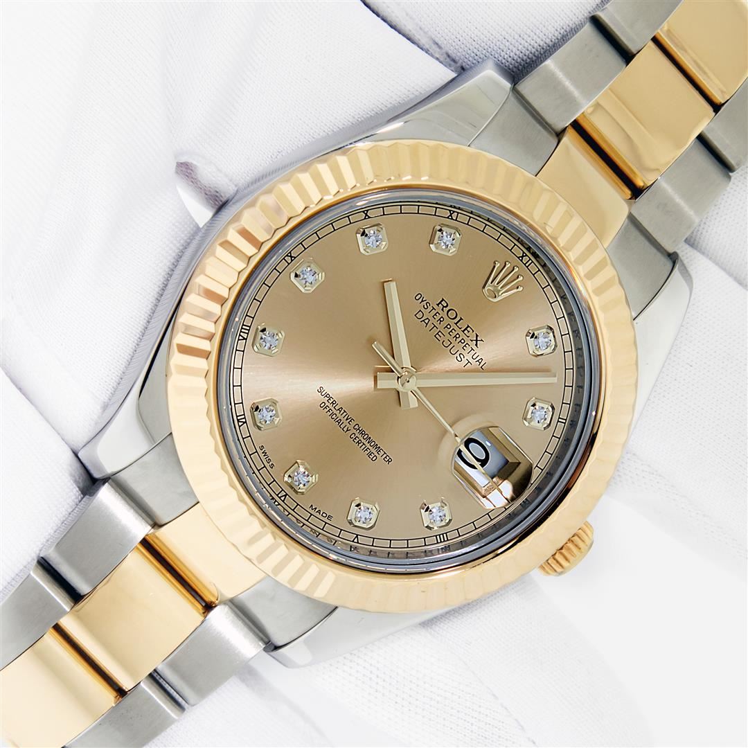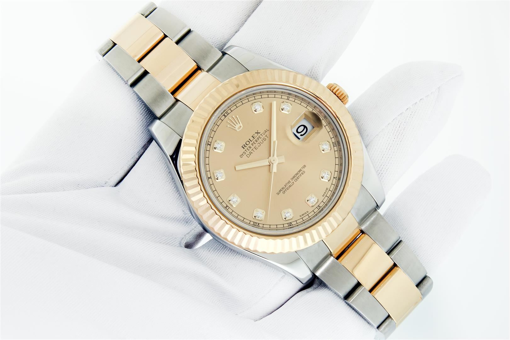 One Mens Pre Owned 18K Yellow Gold & Stainless Steel Rolex Datejust 2 41MM Polished, Serviced & Electronically Tested, Rolex Yellow Gold & Stainless Steel Case: 41mm, Rolex Yellow Gold Crown, Rolex Bezel: 18K Yellow Gold Fluted Bezel. Crystal: Sapphire With Magnified Date Window. Rolex Hands: Rolex Hands. Rolex Movement: Automatic Winding Movement 3136. Rolex Dial: Factory Champagne Diamond Dial With Square Roman Track, Diamond Count: 10 Diamonds in Dial, VS Clarity. Date Window: 3 O'Clock Position Date Display, Quickset, Model: Datejust 41. Condition: G-6 Extra Fine. Rolex Bracelet: Two Tone 18K Yellow Gold & Stainless Steel Oyster Band. Bright Polish. 7.0 Inch Length, Adjustable. Standard Clasp, With Rolex Logo. This Watch Has Been Serviced And Polished It Is Free Of All Scratches And Dents.