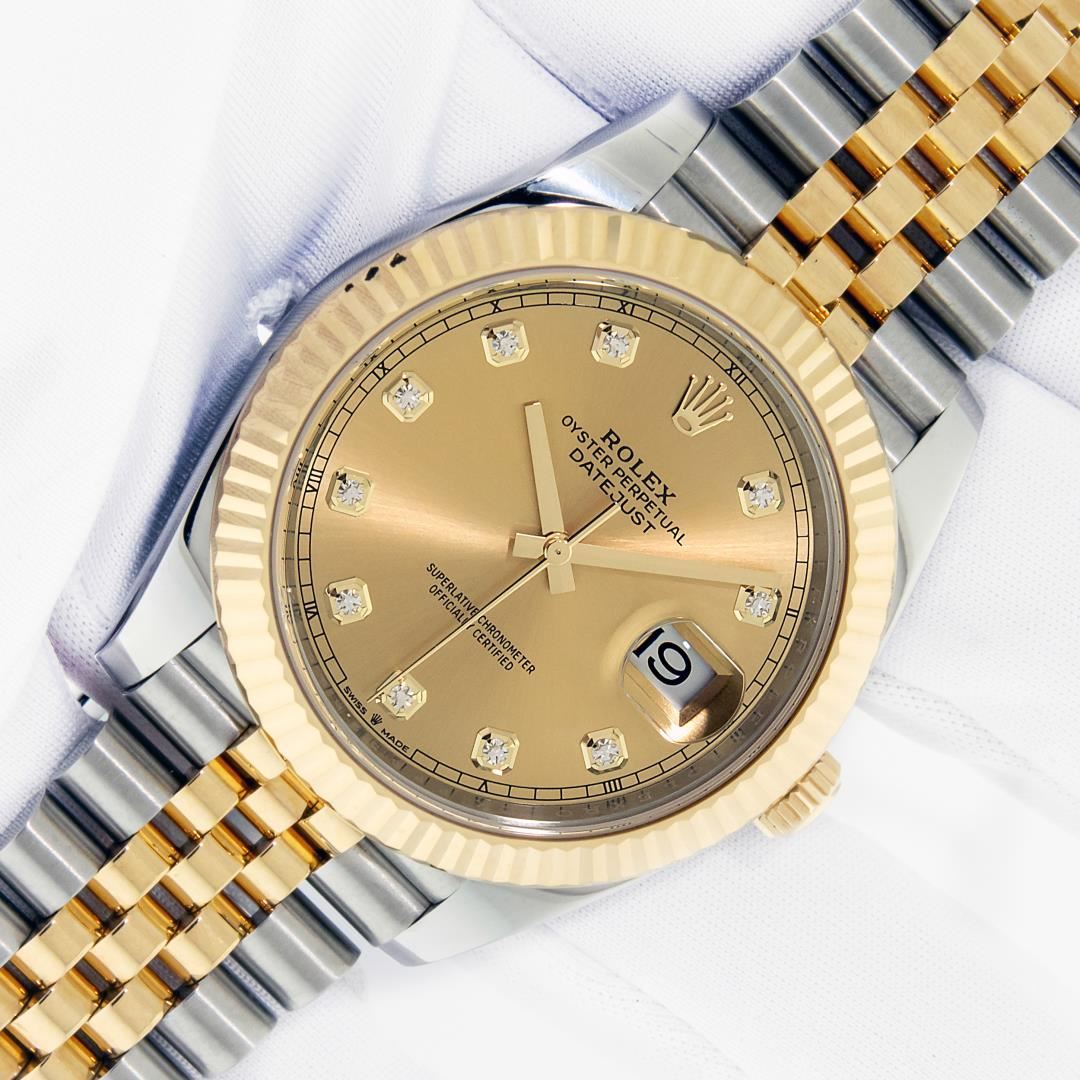 One Mens Pre Owned 18K Yellow Gold & Stainless Steel Rolex Datejust 41MM Polished, Serviced & Electronically Tested, Rolex Yellow Gold & Stainless Steel Case: 41mm, Rolex Yellow Gold Crown, Rolex Bezel: 18K Yellow Gold Fluted Bezel. Crystal: Sapphire With Magnified Date Window. Rolex Hands: Solid Hands. Rolex Movement: Automatic Winding Movement 3235. Rolex Dial: Factory Champagne Diamond Dial With Square Roman Track, Diamond Count: 10 Diamonds On Dial, Clarity: VVS. Date Window: 3 O'Clock Position Date Display, Quickset, Model: Datejust 41. Condition: G-6 Extra Fine. Rolex Bracelet: Two Tone 18K Yellow Gold & Stainless Steel Jubilee Band. Bright Polish. 7.0 Inch Length, Adjustable. Standard Clasp, With Rolex Logo. This Watch Has Been Serviced And Polished It Is Free Of All Scratches And Dents. This Watch Comes With Rolex Box & Card.