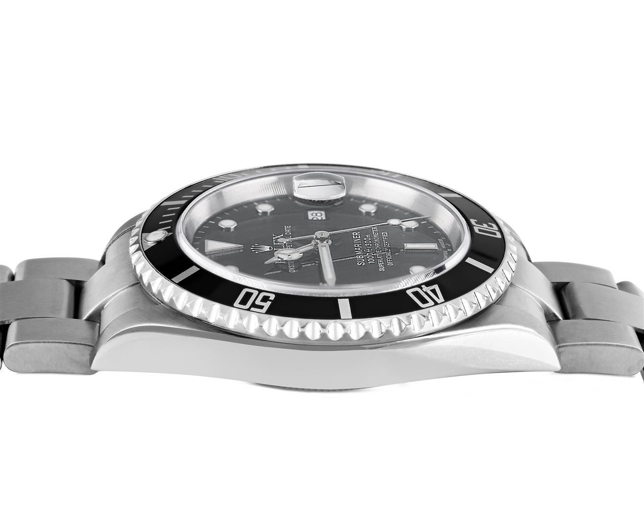 One Mens Pre Owned Rolex Stainless Steel Submariner With Date Polished, Serviced & Electronically Tested, Rolex Stainless Steel Case: 40mm, Rolex Stainless Steel Crown, Rolex Bezel: Stainless Steel Rotatable Bezel With Black Insert. Crystal: Sapphire With Magnified Date Window. Rolex Movement: Automatic Winding Movement Caliber 3135. Rolex Dial: Black Submariner Dial with Luminous Index Hour Markers And Dash Track. Date Window: 3 O'Clock Position Date Display, Model: No Holes Date Submariner, Quickset, Condition: G-6 Extra Fine. Rolex Bracelet: Stainless Steel Oyster Band. Bright Polish & Satin Finish. 7.0 Inch Length, Adjustable. Fold Clasp, With Rolex Logo. This Watch Comes With A Rolex Box.