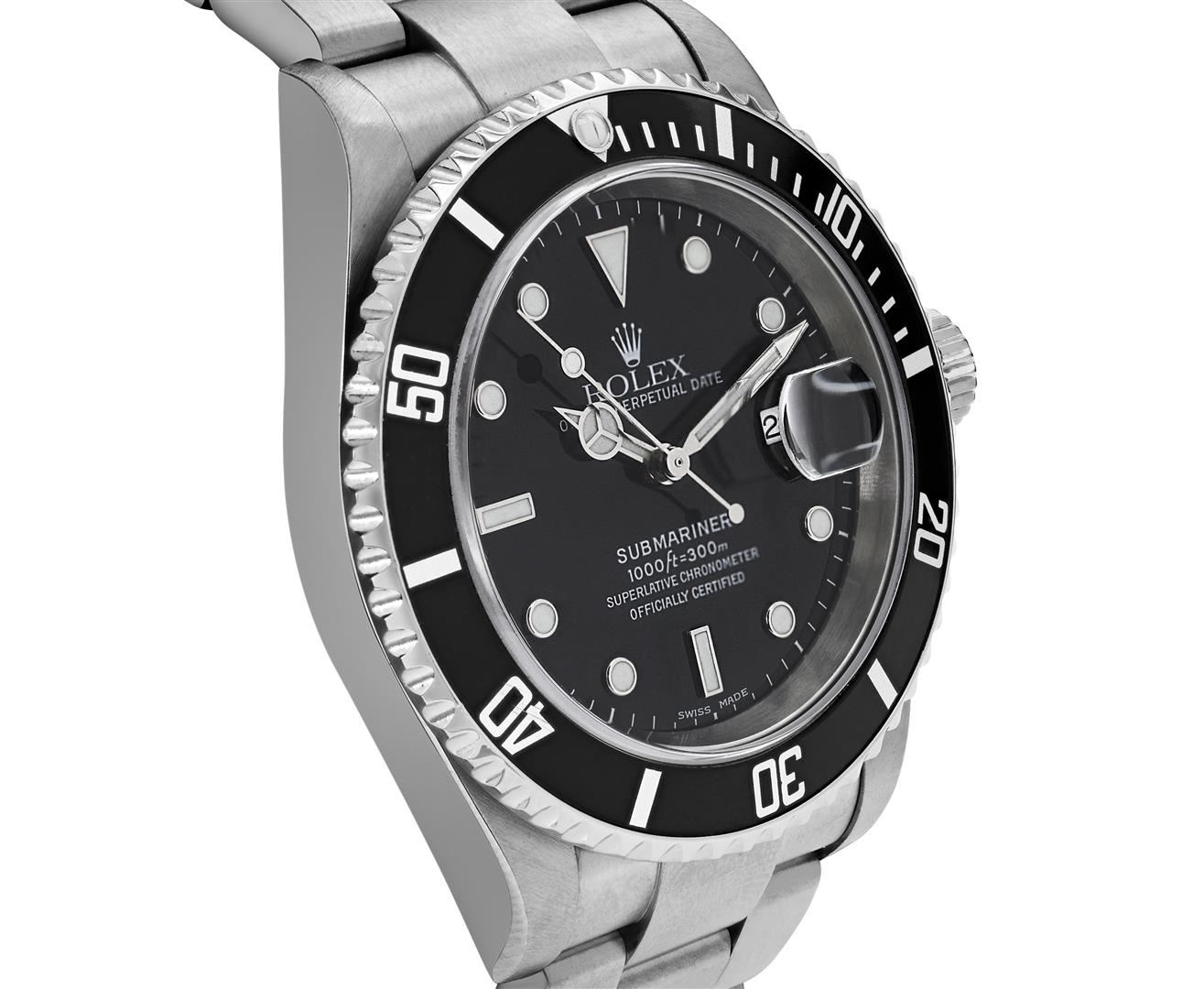 One Mens Pre Owned Rolex Stainless Steel Submariner With Date Polished, Serviced & Electronically Tested, Rolex Stainless Steel Case: 40mm, Rolex Stainless Steel Crown, Rolex Bezel: Stainless Steel Rotatable Bezel With Black Insert. Crystal: Sapphire With Magnified Date Window. Rolex Movement: Automatic Winding Movement Caliber 3135. Rolex Dial: Black Submariner Dial with Luminous Index Hour Markers And Dash Track. Date Window: 3 O'Clock Position Date Display, Model: No Holes Date Submariner, Quickset, Condition: G-6 Extra Fine. Rolex Bracelet: Stainless Steel Oyster Band. Bright Polish & Satin Finish. 7.0 Inch Length, Adjustable. Fold Clasp, With Rolex Logo. This Watch Comes With A Rolex Box.
