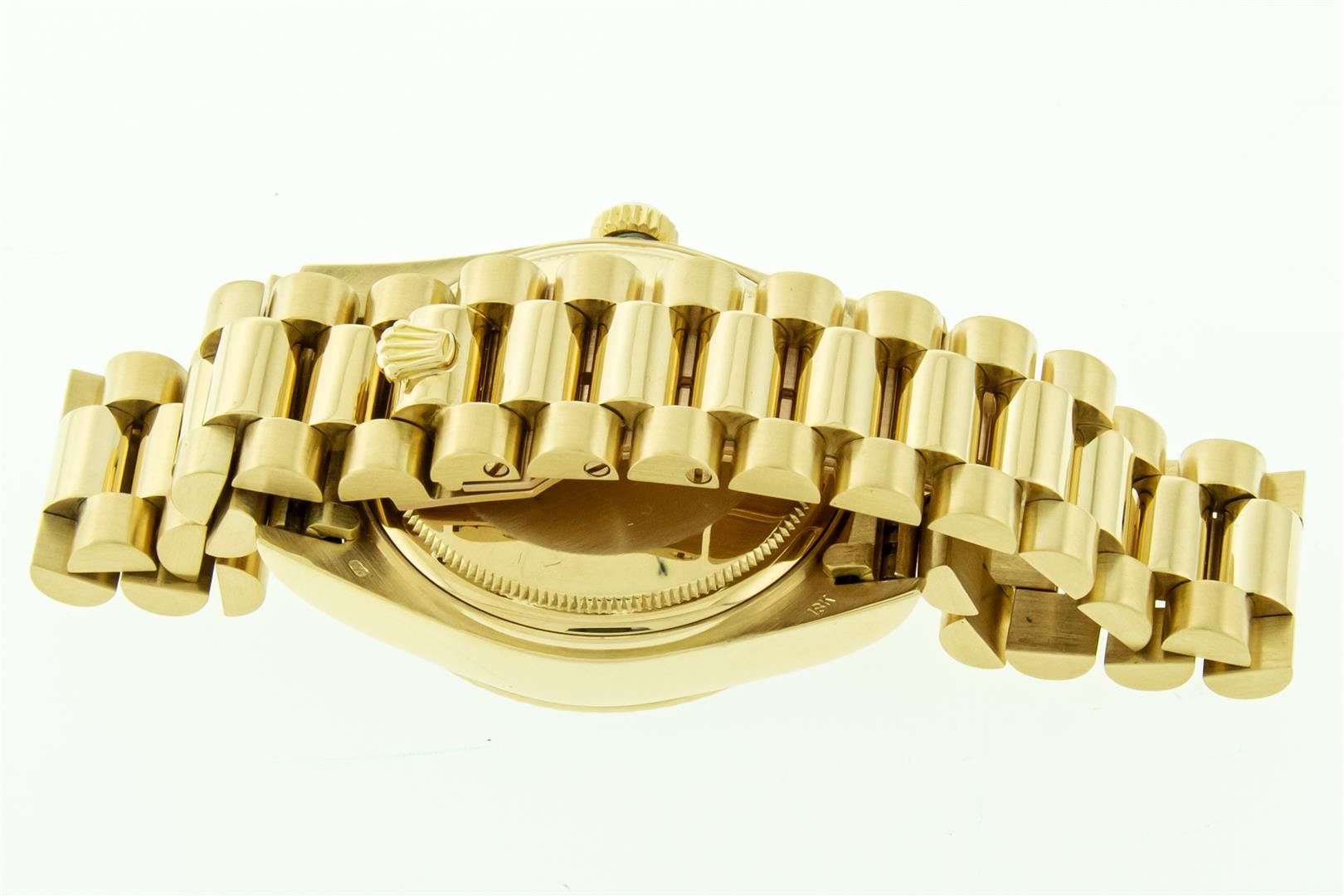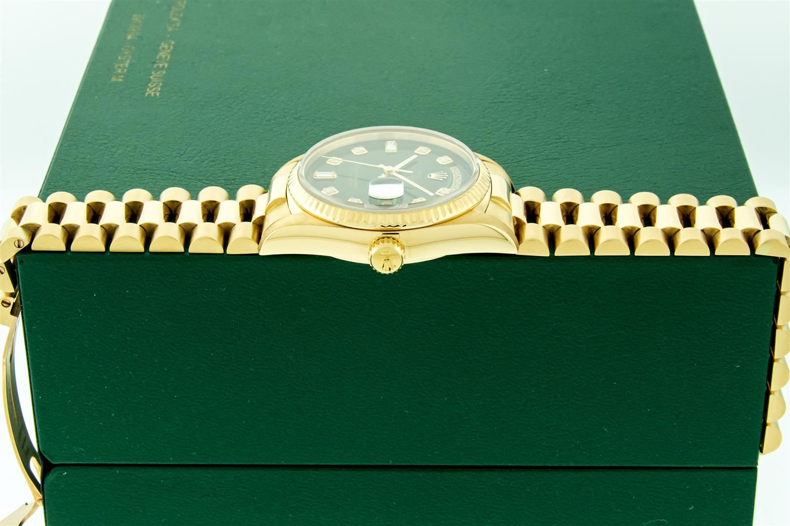 One Mens Pre Owned Quickset Rolex Day Date 18K Yellow Gold Presidential Polished, Serviced & Electronically Tested, Rolex 18K Yellow Gold Case: 36mm, Rolex 18K Yellow Gold Crown, Rolex Bezel: 18K Yellow Gold Fluted Bezel. Custom Crystal: New Scratch Resistant Sapphire Crystal. Custom Hands: New Luminescent Hands. Rolex Movement: Automatic Quickset Winding Movement Caliber 3055. Custom Dial: Refinished To Green Vignette With Custom Added Genuine Single Cut Diamonds, Diamond Count: 8 Diamonds On Dial + 2 Baguettes On 6 + & 9, Color: G To H, Clarity: VS. Date Window: 3 O'Clock Position, Day Display: 12 O'Clock Position, Single Quickset, Model: Day Date President. Condition: G-6 Extra Fine. Rolex Bracelet: 18K Yellow Gold President Band With Hidden Clasp, Bright & Satin Polish. 7.0 Inch Length, Standard President Clasp, With Rolex Logo. This Watch Comes With A Rolex Box, Rolex Booklets, Rolex Wallet, Rolex Hang Tag, & Rolex Polishing Cloth.