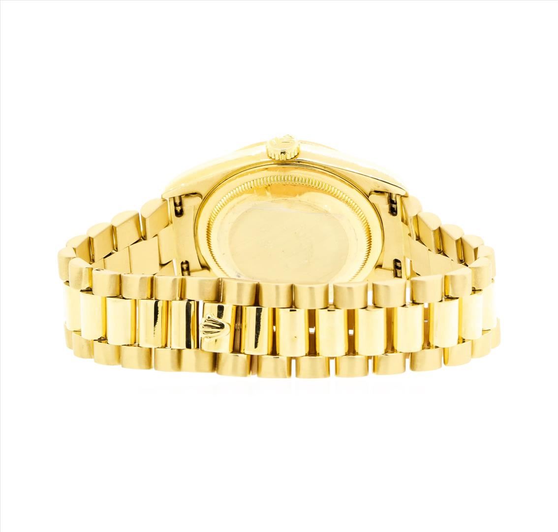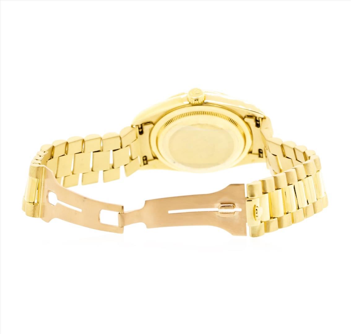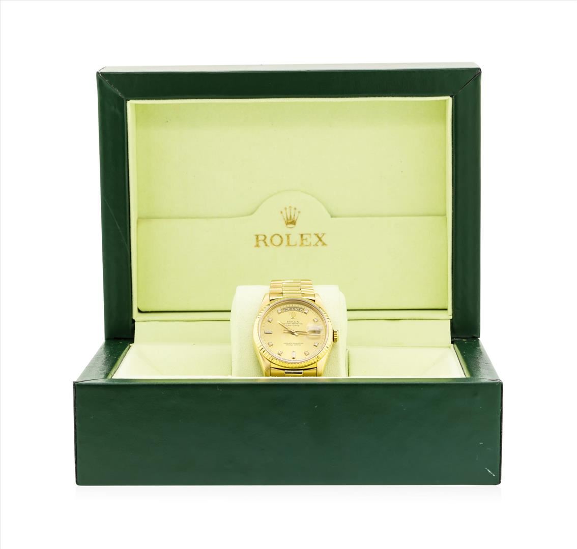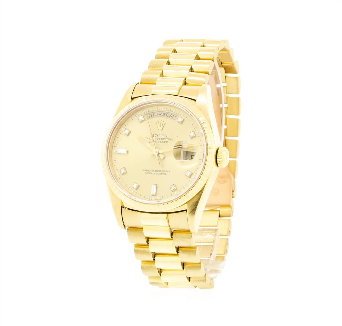 One gents, hand crafted & machine milled Rolex DayDate wristwatch, the President, electronically tested 18KT yellow gold, Swiss Hallmarked Case: 36mm oyster, Rolex Signature Crown: twinlock with logo, Crystal: synthetic sapphire cyclops lens, Bezel: fluted. Circa: 1991.Automatic Movement: superlative chronometer, Rolex signed Dial: Champagne color, with baton hands, & diamond indices, the dial is framed by a bordering minute track, Calendar: double quick set, Rolex Bracelet: 18KT yellow gold, Condition: G-6 Extra Fine. Bright polish & satin finish. Seven and one half inch length. Swiss & Rolex Hallmarked clasp, with logo. Total Weight of Watch 132.97gm. AIG Appraised.