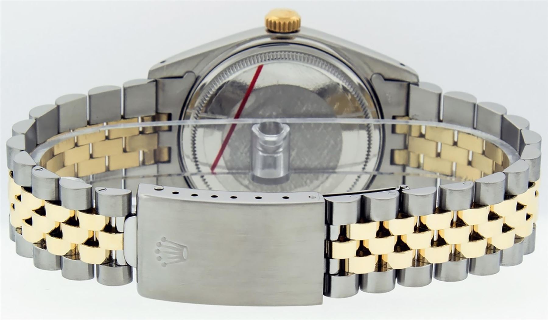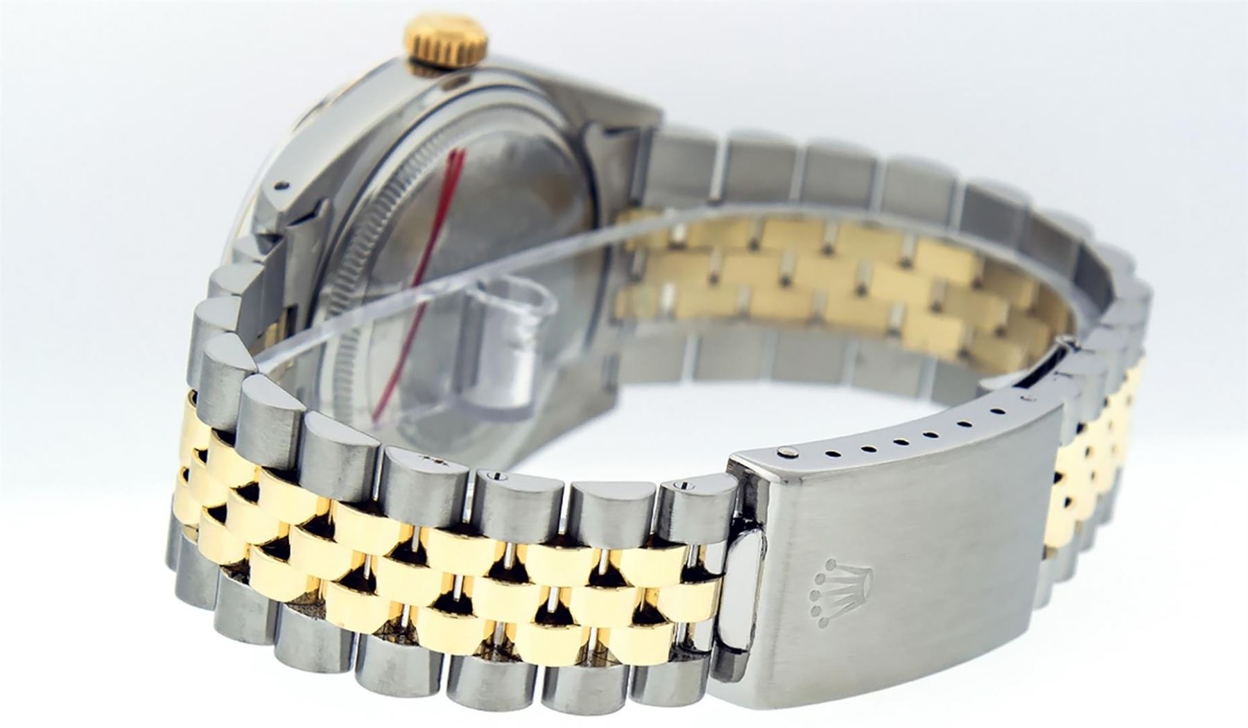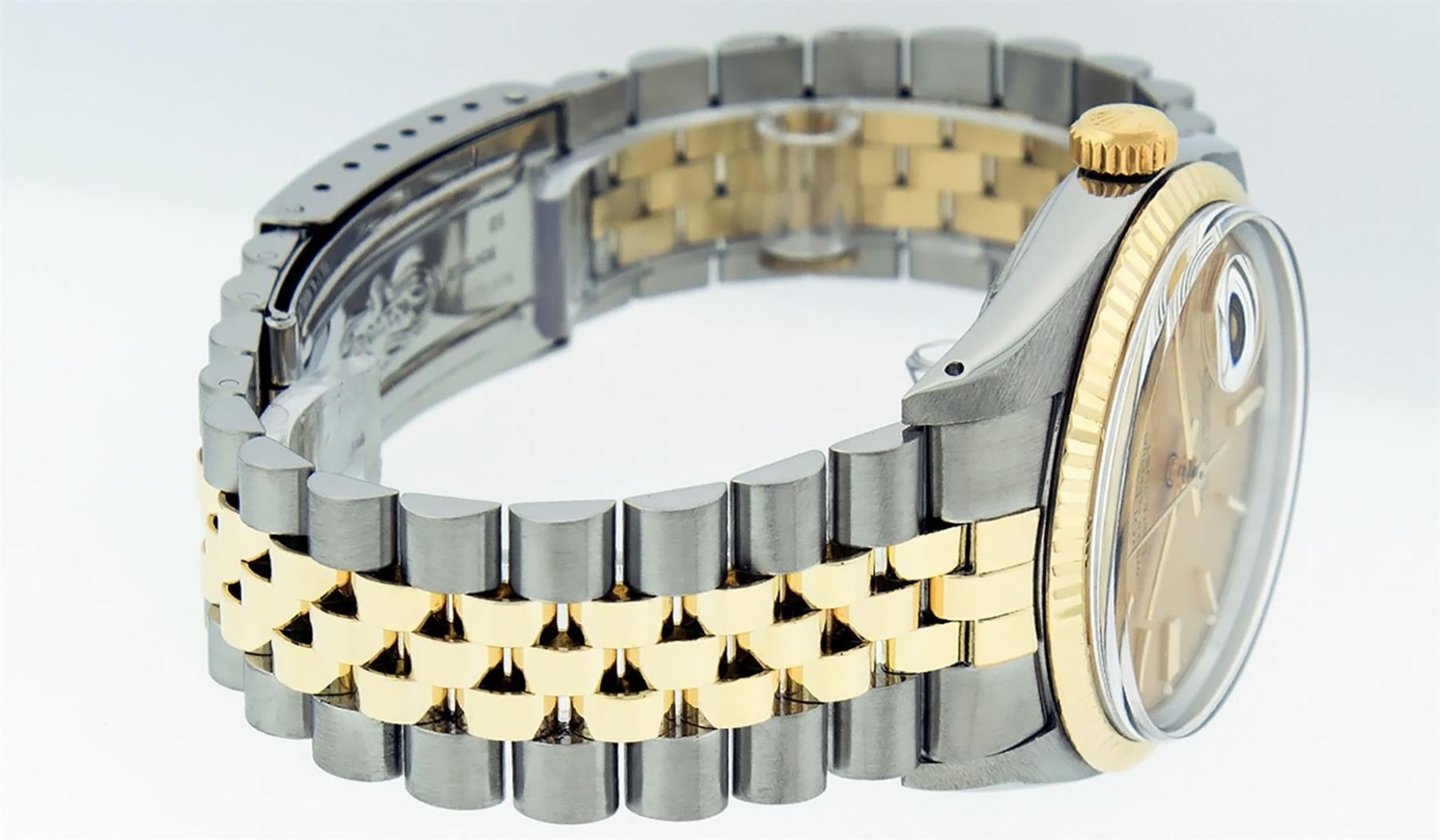 One Mens Pre Owned Quickset Two Tone 14K Yellow Gold And Stainless Steel Datejust Polished, Serviced & Electronically Tested, Yellow Gold & Stainless Steel Case: 36mm, Yellow Gold Crown, Rolex Bezel: 14K Yellow Gold Fluted Bezel. Custom Crystal: New Acrylic With Magnified Date Window. Hands: Luminescent Hands. Rolex Movement: Automatic Winding Movement 3035. Rolex Dial: Champagne Linen Dial With Index Hour Markers and Small Track With Lumi Dots. Date Window: 3 O'Clock Position Date Display, Quickset, Model: Datejust. Condition: G-6 Extra Fine. Rolex Bracelet: Two Tone 14K Yellow Gold & Stainless Steel Jubilee Band. Bright Polish. 7.0 Inch Length, Adjustable. Standard Clasp, With Rolex Logo. This Watch Has Been Serviced Time Tested And Is In Excellent Condition It Is Free Of All Scratches And Dents.