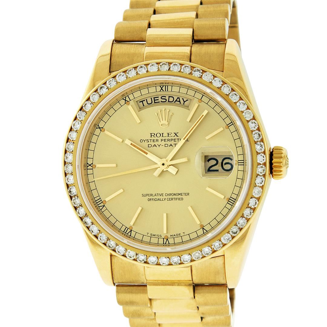 One Mens Rolex Day Date 18K Yellow Gold President Polished, Serviced & Electronically Tested, Rolex 18K Yellow Gold Case: 36mm, Rolex 18K Yellow Gold Crown, Custom Bezel: New 18K Yellow Gold Channel Set Diamond Bezel, Diamond Count: 54 Diamonds On Bezel. Total Bezel Weight 1.3 Carat, Clarity: SI-VS, Color: G to H. Custom Crystal: New Sapphire With Magnified Date Window. Hands: Luminescent Hands. Rolex Movement: Automatic Winding Movement Caliber 3055. Rolex Dial: Champagne Index With Square Roman Track And Lumi Dot. Date Window: 3 O'Clock Position Date Display, Day Window: 12 O'Clock Position Date Display. Quickset, Model: Day Date Quickset President. Condition: G-6 Extra Fine. Rolex Bracelet: 18K Yellow Gold President Band. Bright Polish. 7.0 Inch Length, Standard Hidden President Clasp, With Rolex Logo. This Pre Owned Watch Has Been Serviced Time Tested And Is In Excellent Condition It Is Free Of All Scratches And Dents.