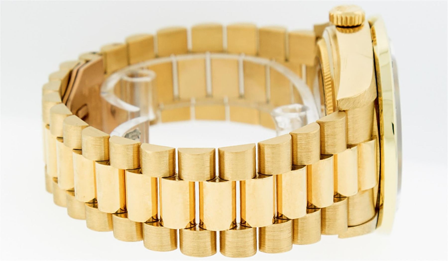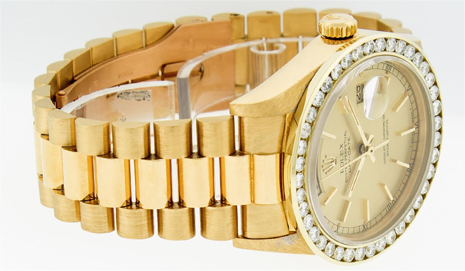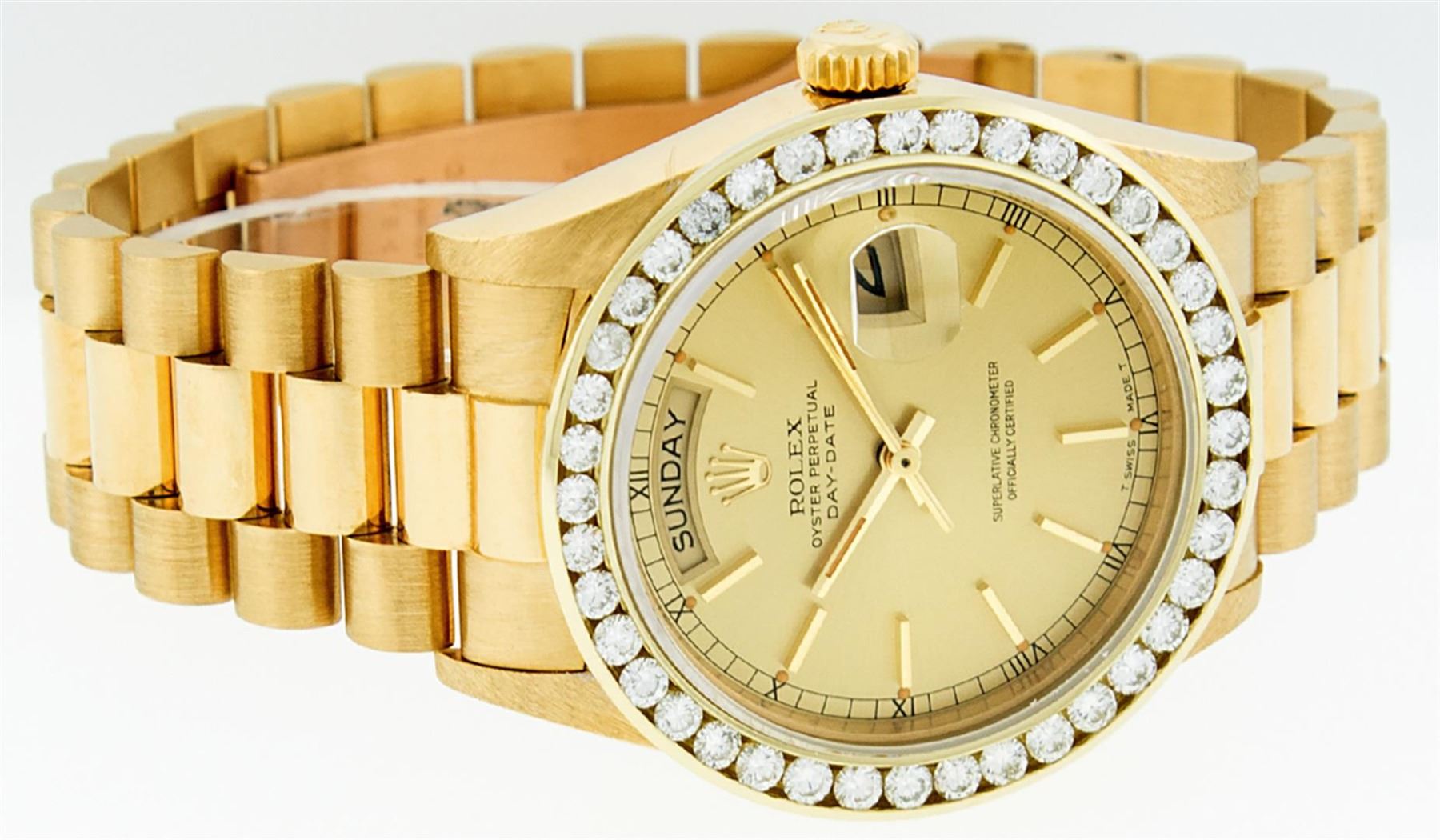 One Mens Rolex Day Date 18K Yellow Gold President Polished, Serviced & Electronically Tested, Rolex 18K Yellow Gold Case: 36mm, Rolex 18K Yellow Gold Crown, Custom Bezel: New 18K Yellow Gold Channel Bezel Set With Genuine Diamonds, Diamond Count: 40 Diamonds On Bezel Bezel. Total Bezel Weight 3.0 Carat, Clarity: SI-VS, Color: G to H. Custom Crystal: New Sapphire With Magnified Date Window. Hands: Luminescent Hands. Rolex Movement: Automatic Winding Movement Caliber 3055. Rolex Dial: Champagne Index With Square Roman Track And Lumi Dots. Date Window: 3 O'Clock Position Date Display, Day Window: 12 O'Clock Position Date Display. Quickset, Model: Day Date Quickset President. Condition: G-6 Extra. Rolex Bracelet: 18K Yellow Gold President. Bright Polish. 7.0 Inch Length, Standard Hidden President Clasp President Band, With Rolex Logo. This Pre Owned Watch Has Been Serviced Time Tested And Is In Excellent Condition It Is Free Of All Scratches And Dents.
