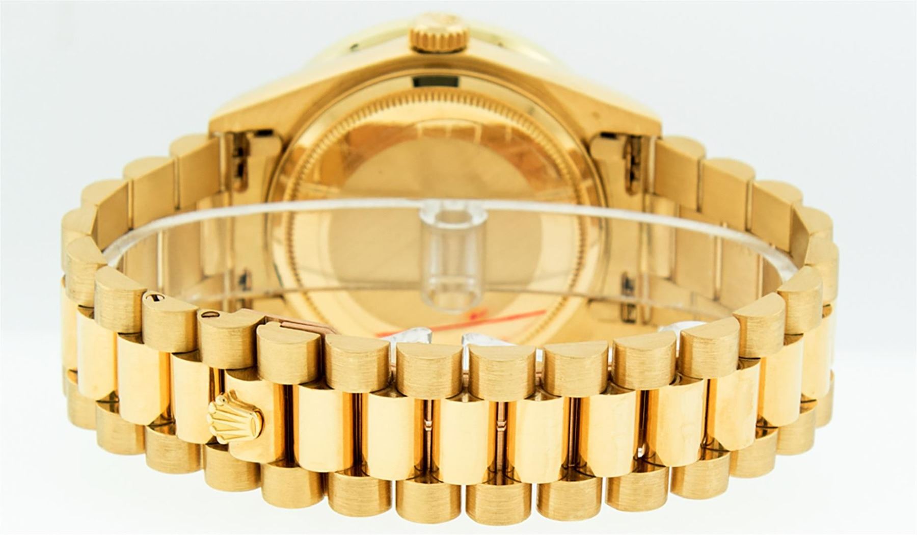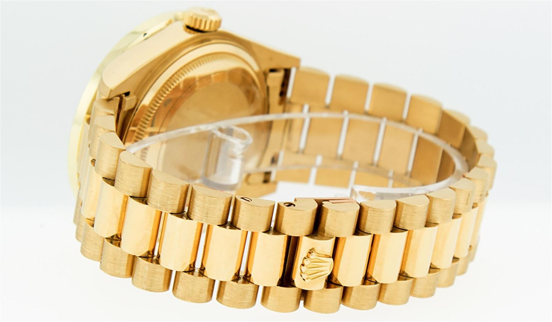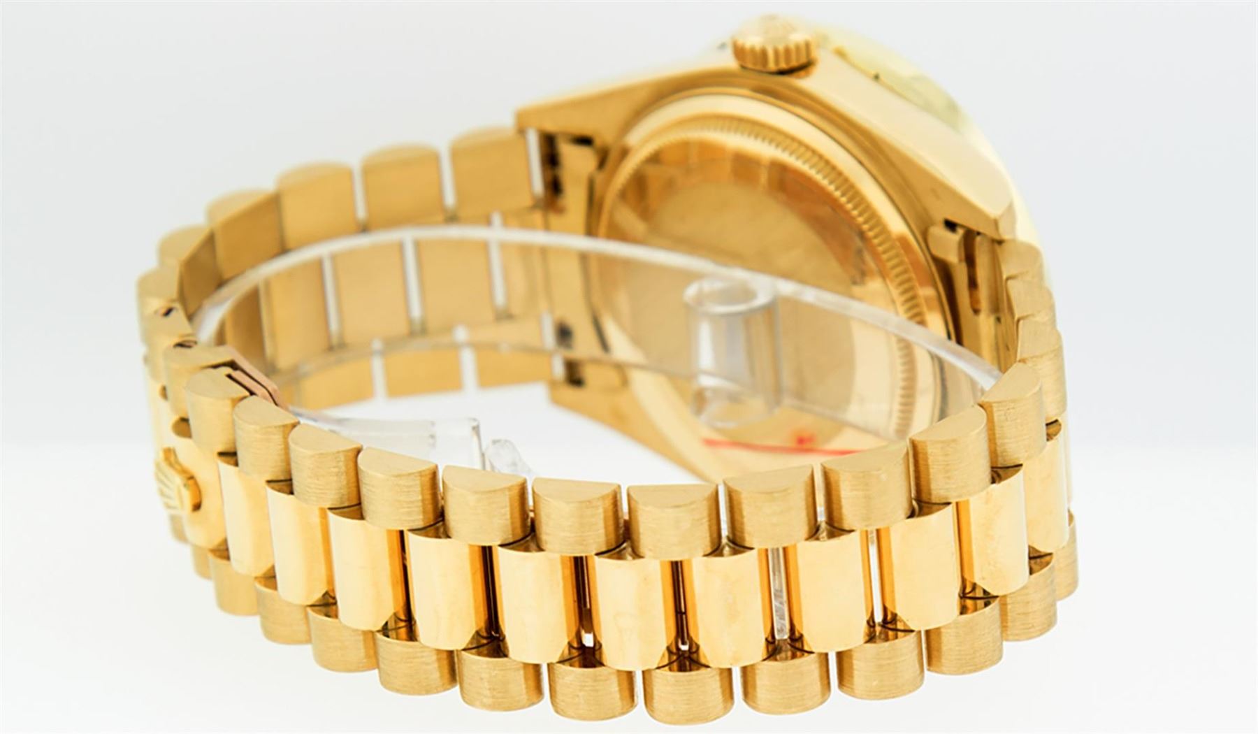 One Mens Rolex Day Date 18K Yellow Gold President Polished, Serviced & Electronically Tested, Rolex 18K Yellow Gold Case: 36mm, Rolex 18K Yellow Gold Crown, Custom Bezel: New 18K Yellow Gold Channel Bezel Set With Genuine Diamonds, Diamond Count: 40 Diamonds On Bezel Bezel. Total Bezel Weight 3.0 Carat, Clarity: SI-VS, Color: G to H. Custom Crystal: New Sapphire With Magnified Date Window. Hands: Luminescent Hands. Rolex Movement: Automatic Winding Movement Caliber 3055. Rolex Dial: Champagne Index With Square Roman Track And Lumi Dots. Date Window: 3 O'Clock Position Date Display, Day Window: 12 O'Clock Position Date Display. Quickset, Model: Day Date Quickset President. Condition: G-6 Extra. Rolex Bracelet: 18K Yellow Gold President. Bright Polish. 7.0 Inch Length, Standard Hidden President Clasp President Band, With Rolex Logo. This Pre Owned Watch Has Been Serviced Time Tested And Is In Excellent Condition It Is Free Of All Scratches And Dents.