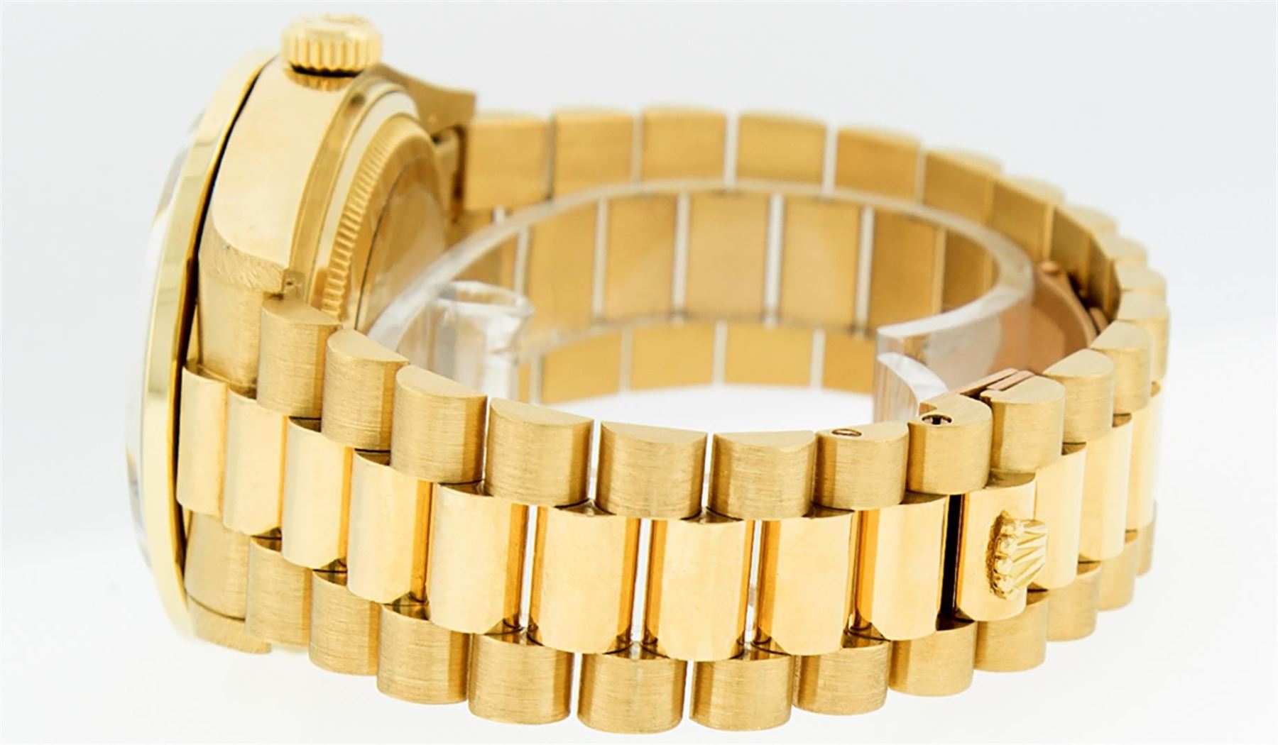 One Mens Rolex Day Date 18K Yellow Gold President Polished, Serviced & Electronically Tested, Rolex 18K Yellow Gold Case: 36mm, Rolex 18K Yellow Gold Crown, Custom Bezel: New 18K Yellow Gold Channel Set With Custom Added Genuine Rubies and Diamonds, Diamond + Stone Count: 52 Diamonds + 4 Rubies On Bezel. Total Weight 1.30 Carat, Clarity: SI-VS, Color: G to H. Custom Crystal: New Sapphire With Magnified Date Window. Hands: Luminescent Hands. Rolex Movement: Automatic Winding Movement Caliber 3055. Rolex Dial: Champagne Index With Roman Track & Lumi Dots. Date Window: 3 O'Clock Position Date Display, Day Window: 12 O'Clock Position Date Display. Quickset, Model: Day Date Quickset President. Condition: G-6 Extra Fine. Rolex Bracelet: 18K Yellow Gold President Band. Bright Polish. 7.0 Inch Length, Standard Hidden President Clasp President Band, With Rolex Logo. This Pre Owned Watch Has Been Serviced Time Tested And Is In Excellent Condition It Is Free Of All Scratches And Dents.
