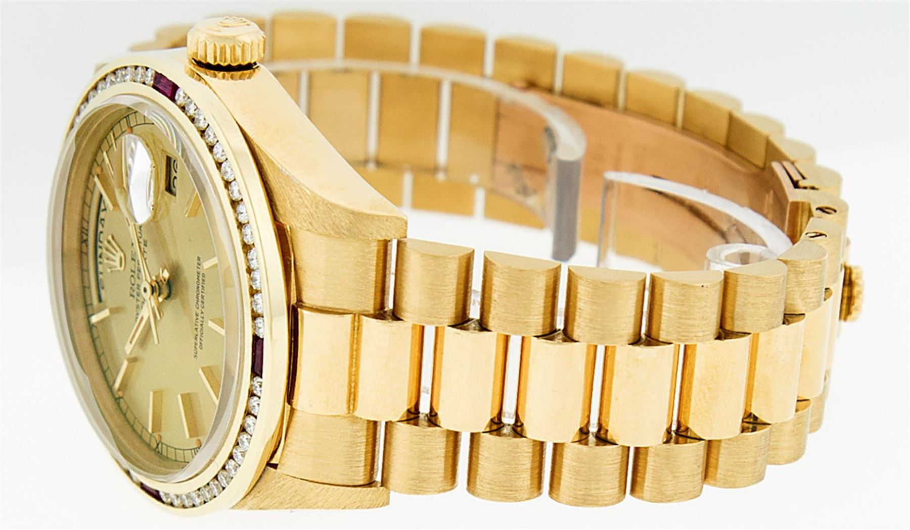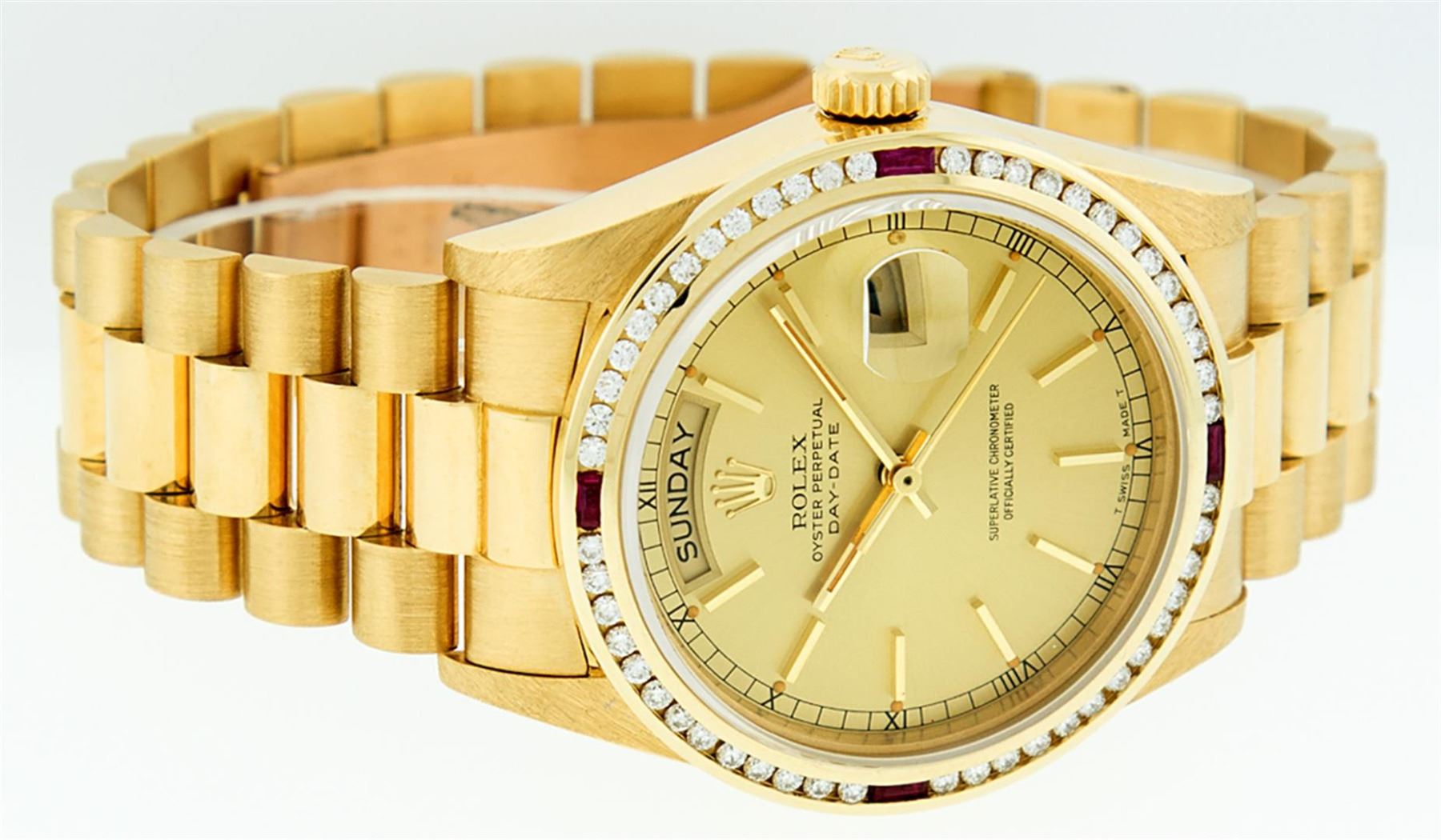 One Mens Rolex Day Date 18K Yellow Gold President Polished, Serviced & Electronically Tested, Rolex 18K Yellow Gold Case: 36mm, Rolex 18K Yellow Gold Crown, Custom Bezel: New 18K Yellow Gold Channel Set With Custom Added Genuine Rubies and Diamonds, Diamond + Stone Count: 52 Diamonds + 4 Rubies On Bezel. Total Weight 1.30 Carat, Clarity: SI-VS, Color: G to H. Custom Crystal: New Sapphire With Magnified Date Window. Hands: Luminescent Hands. Rolex Movement: Automatic Winding Movement Caliber 3055. Rolex Dial: Champagne Index With Roman Track & Lumi Dots. Date Window: 3 O'Clock Position Date Display, Day Window: 12 O'Clock Position Date Display. Quickset, Model: Day Date Quickset President. Condition: G-6 Extra Fine. Rolex Bracelet: 18K Yellow Gold President Band. Bright Polish. 7.0 Inch Length, Standard Hidden President Clasp President Band, With Rolex Logo. This Pre Owned Watch Has Been Serviced Time Tested And Is In Excellent Condition It Is Free Of All Scratches And Dents.
