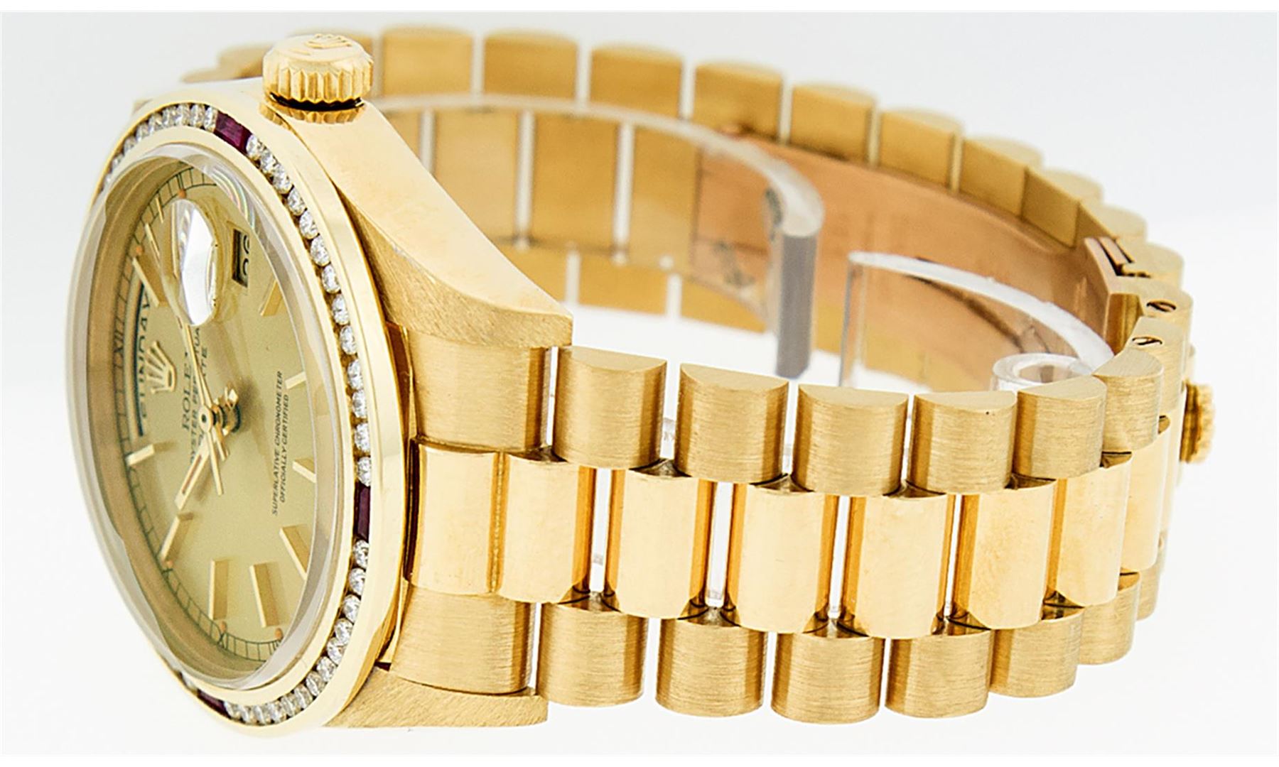 One Mens Rolex Day Date 18K Yellow Gold President Polished, Serviced & Electronically Tested, Rolex 18K Yellow Gold Case: 36mm, Rolex 18K Yellow Gold Crown, Custom Bezel: New 18K Yellow Gold Channel Set With Custom Added Genuine Rubies and Diamonds, Diamond + Stone Count: 52 Diamonds + 4 Rubies On Bezel. Total Weight 1.30 Carat, Clarity: SI-VS, Color: G to H. Custom Crystal: New Sapphire With Magnified Date Window. Hands: Luminescent Hands. Rolex Movement: Automatic Winding Movement Caliber 3055. Rolex Dial: Champagne Index With Roman Track & Lumi Dots. Date Window: 3 O'Clock Position Date Display, Day Window: 12 O'Clock Position Date Display. Quickset, Model: Day Date Quickset President. Condition: G-6 Extra Fine. Rolex Bracelet: 18K Yellow Gold President Band. Bright Polish. 7.0 Inch Length, Standard Hidden President Clasp President Band, With Rolex Logo. This Pre Owned Watch Has Been Serviced Time Tested And Is In Excellent Condition It Is Free Of All Scratches And Dents.