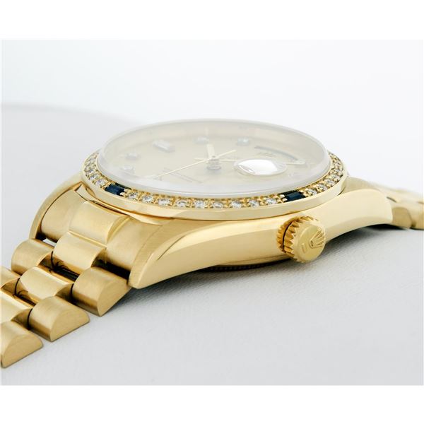 One Mens Quickset Rolex Day Date 18K Yellow Gold President Polished, Serviced & Electronically Tested, Rolex 18K Yellow Gold Case: 36mm, Rolex 18K Yellow Gold Crown, Custom Bezel: New 18K Yellow Diamond + Sapphire Beadset Bezel, Stone Count: 36 Diamonds + 4 Sapphires, Total Weight.75 Carat, Clarity: SI-VS, Color: G to H. Custom Crystal: New Sapphire With Magnified Date Window. Custom Hands: New Luminescent Hands. Rolex Movement: Automatic Quickset Winding Movement Caliber 3055. Rolex Dial: Factory Champagne Diamond Dial With Dash Track And Lumi Dots, Stone Count: 8 Diamonds + 2 Baguette Diamonds, Clarity: VS. Date Window: 3 O'Clock Position, Day Display: 12 O'Clock Position, Single Quickset, Model: Day Date Quickset President. Condition: G-6 Extra Fine. Rolex Bracelet: 18K Yellow Gold President Band With Hidden Clasp, Bright & Satin Polish. 7.0 Inch Length, Standard Hidden President Clasp, With Rolex Logo. This Pre Owned Watch Has Been Serviced Time Tested And Is In Excellent Condition It Is Free Of All Scratches And Dents.