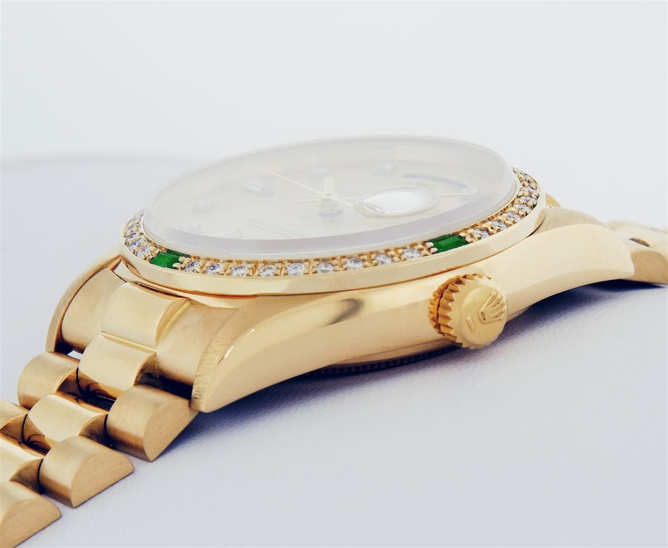 One Mens Quickset Rolex Day Date 18K Yellow Gold President Polished, Serviced & Electronically Tested, Rolex 18K Yellow Gold Case: 36mm, Rolex 18K Yellow Gold Crown, Custom Bezel: New 18K Yellow Diamond + Emerald Beadset Bezel, Stone Count: 36 Diamonds + 4 Emeralds, Total Weight .75 Carat, Clarity: SI-VS, Color: G to H. Custom Crystal: New Sapphire With Magnified Date Window. Custom Hands: New Luminescent Hands. Rolex Movement: Automatic Quickset Winding Movement Caliber 3055. Rolex Dial: Factory Champagne Diamond Dial With Dash Track And Lumi Dots, Stone Count: 8 Diamonds + 2 Baguettes, Clarity: VS. Date Window: 3 O'Clock Position, Day Display: 12 O'Clock Position, Single Quickset, Model: Day Date Quickset President. Condition: G-6 Extra Fine. Rolex Bracelet: 18K Yellow Gold President Band With Hidden Clasp, Bright & Satin Polish. 7.0 Inch Length, Hidden President Clasp, With Rolex Logo. This Pre Owned Watch Has Been Serviced Time Tested And Is In Excellent Condition It Is Free Of All Scratches And Dents.