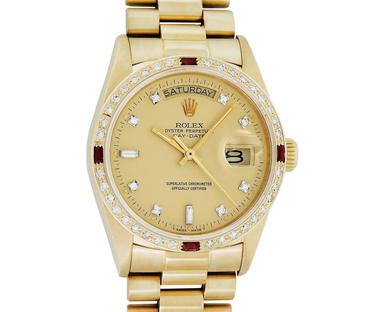 One Mens Quickset Rolex Day Date 18K Yellow Gold President Polished, Serviced & Electronically Tested, Rolex 18K Yellow Gold Case: 36mm, Rolex 18K Yellow Gold Crown, Custom Bezel: New 18K Yellow Diamond + Ruby Beadset Bezel, Stone Count: 36 Diamonds + 4 Rubies, Total Weight .75 Carat, Clarity: SI-VS, Color: G to H. Custom Crystal: New Sapphire With Magnified Date Window. Custom Hands: New Luminescent Hands. Rolex Movement: Automatic Quickset Winding Movement Caliber 3055. Rolex Dial: Factory Champagne Diamond Dial With Dash Track And Lumi Dots, Stone Count: 8 Diamonds + 2 Baguettes, Clarity: VS. Date Window: 3 O'Clock Position, Day Display: 12 O'Clock Position, Single Quickset, Model: Day Date Quickset President. Condition: G-6 Extra Fine. Rolex Bracelet: 18K Yellow Gold President Band With Hidden Clasp, Bright & Satin Polish. 7.0 Inch Length, Hidden President Clasp, With Rolex Logo. This Pre Owned Watch Has Been Serviced Time Tested And Is In Excellent Condition It Is Free Of All Scratches And Dents.