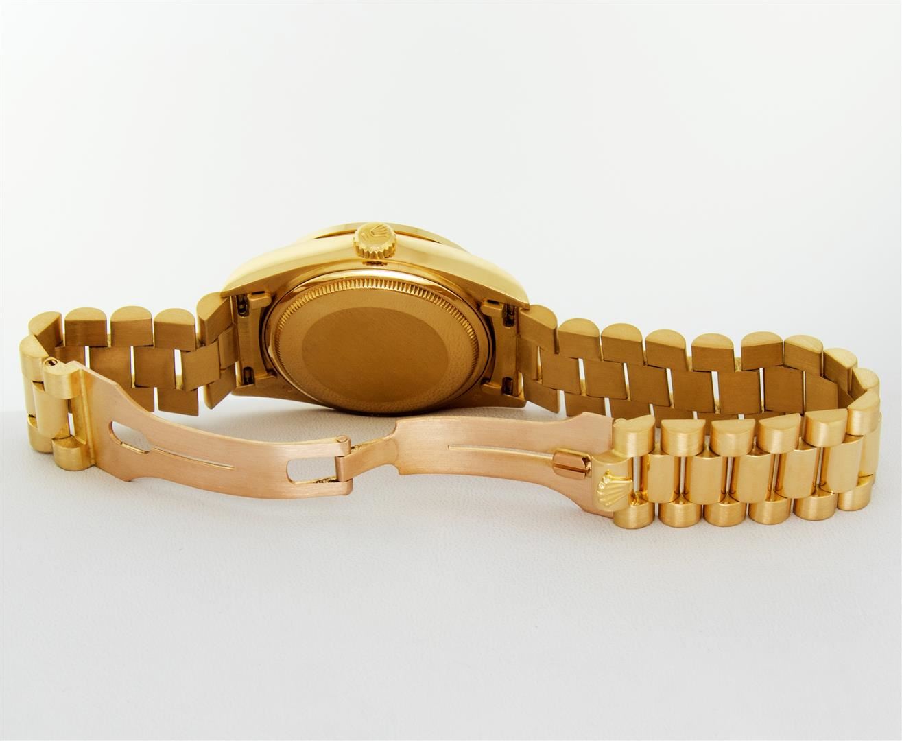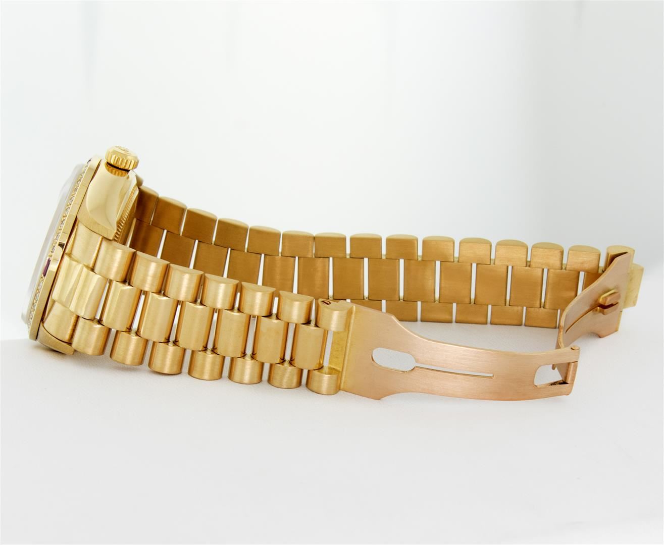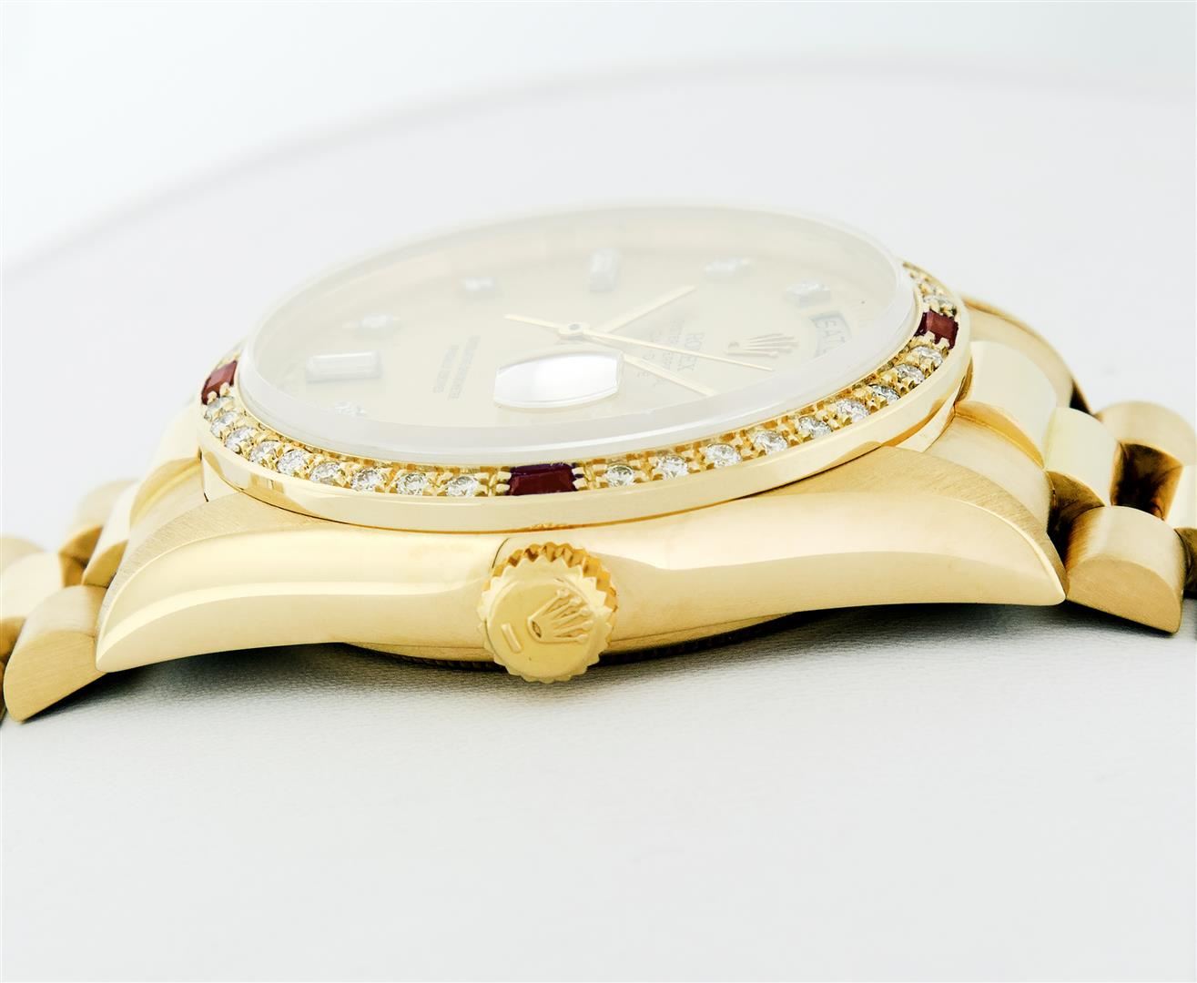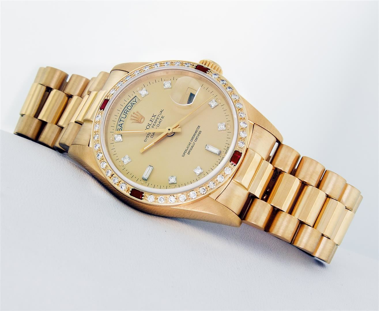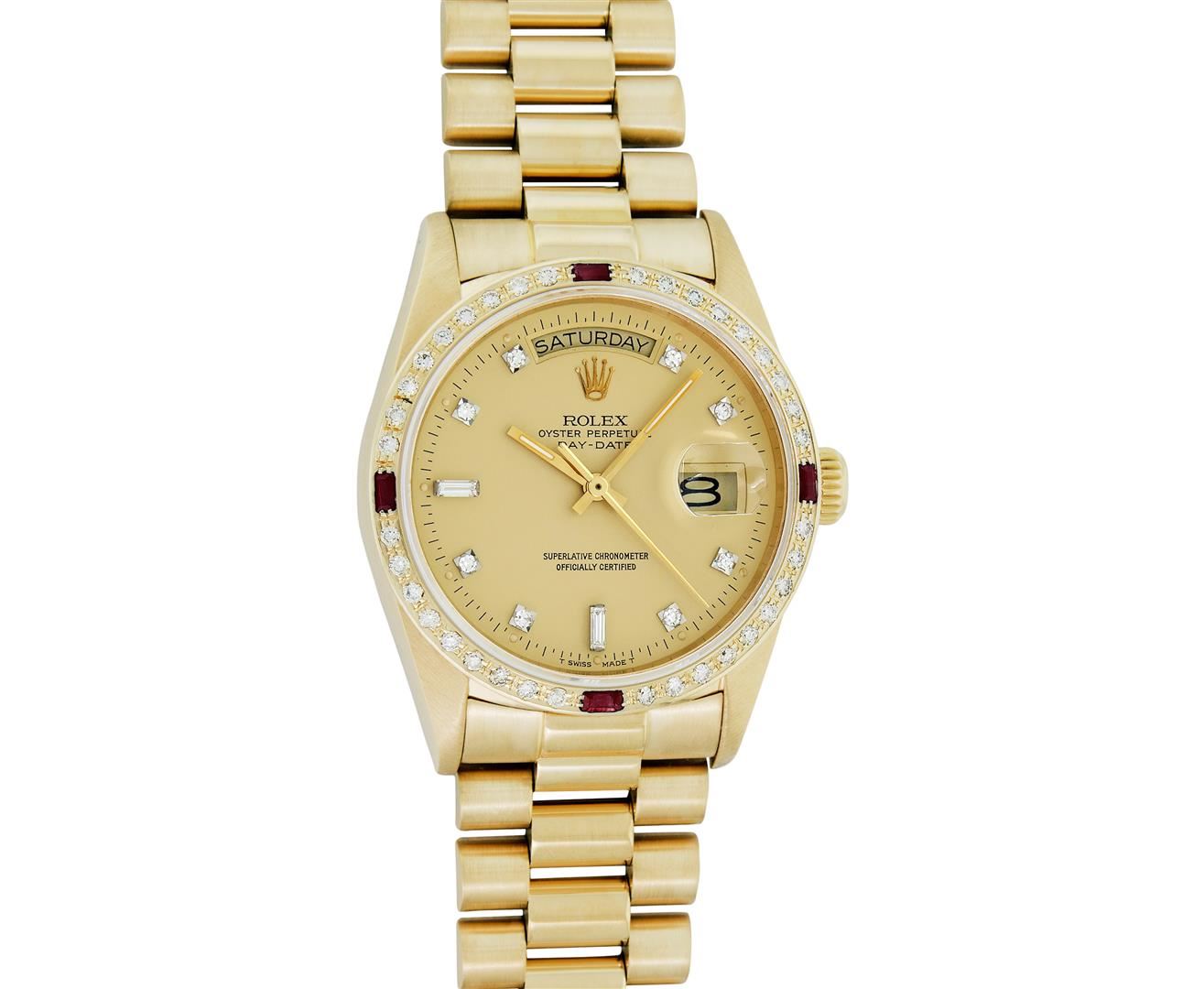 One Mens Quickset Rolex Day Date 18K Yellow Gold President Polished, Serviced & Electronically Tested, Rolex 18K Yellow Gold Case: 36mm, Rolex 18K Yellow Gold Crown, Custom Bezel: New 18K Yellow Diamond + Ruby Beadset Bezel, Stone Count: 36 Diamonds + 4 Rubies, Total Weight .75 Carat, Clarity: SI-VS, Color: G to H. Custom Crystal: New Sapphire With Magnified Date Window. Custom Hands: New Luminescent Hands. Rolex Movement: Automatic Quickset Winding Movement Caliber 3055. Rolex Dial: Factory Champagne Diamond Dial With Dash Track And Lumi Dots, Stone Count: 8 Diamonds + 2 Baguettes, Clarity: VS. Date Window: 3 O'Clock Position, Day Display: 12 O'Clock Position, Single Quickset, Model: Day Date Quickset President. Condition: G-6 Extra Fine. Rolex Bracelet: 18K Yellow Gold President Band With Hidden Clasp, Bright & Satin Polish. 7.0 Inch Length, Hidden President Clasp, With Rolex Logo. This Pre Owned Watch Has Been Serviced Time Tested And Is In Excellent Condition It Is Free Of All Scratches And Dents.