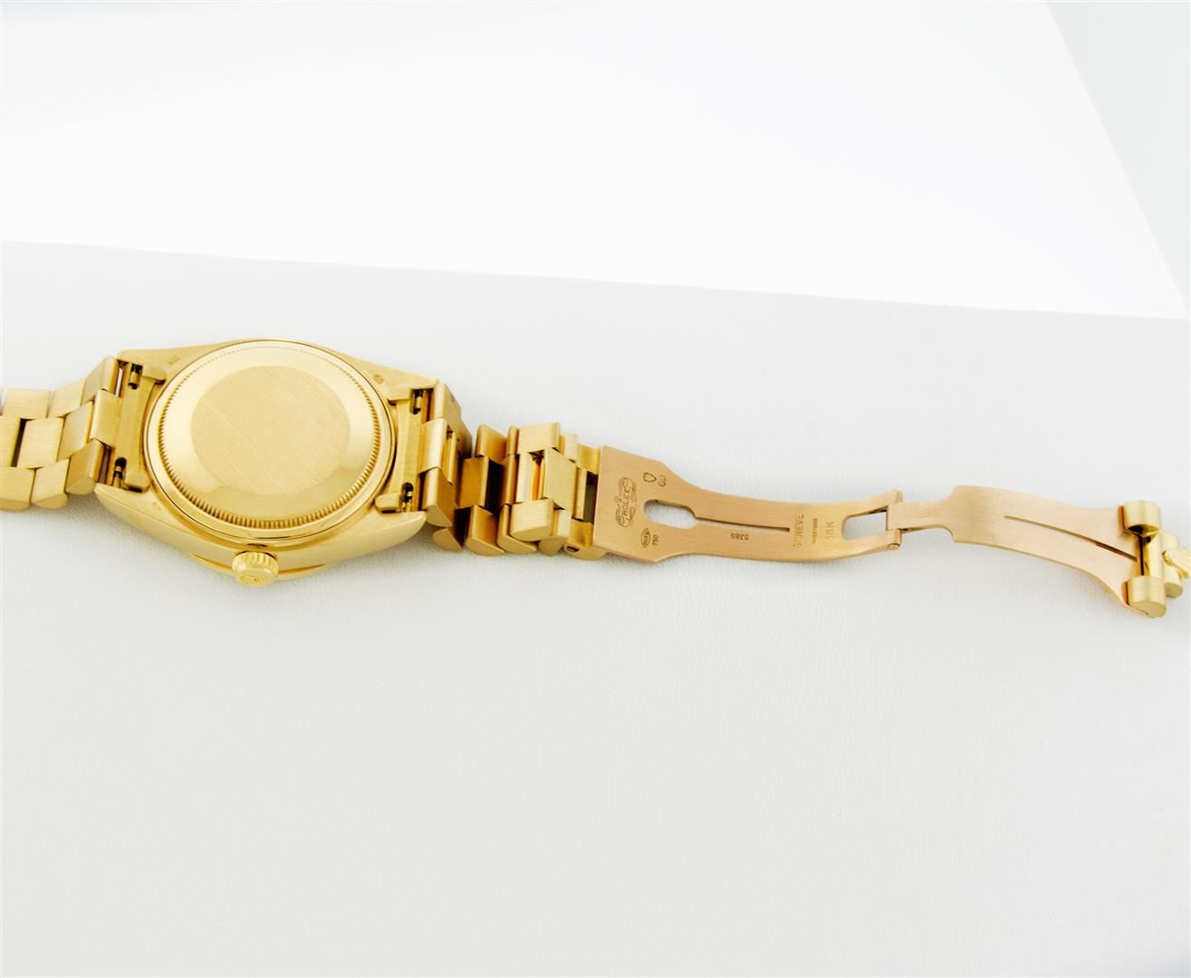 One Mens Quickset Rolex Day Date 18K Yellow Gold President Polished, Serviced & Electronically Tested, Rolex 18K Yellow Gold Case: 36mm, Rolex 18K Yellow Gold Crown, Custom Bezel: New 18K Yellow Diamond + Ruby Beadset Bezel, Stone Count: 36 Diamonds + 4 Rubies, Total Weight.75 Carat, Clarity: SI-VS, Color: G to H. Custom Crystal: New Sapphire With Magnified Date Window. Custom Hands: New Luminescent Hands. Rolex Movement: Automatic Quickset Winding Movement Caliber 3055. Rolex Dial: Factory Champagne Diamond Dial With Dash Track And Lumi Dots, Stone Count: 8 Diamonds + 2 Baguettes, Clarity: VS. Date Window: 3 O'Clock Position, Day Display: 12 O'Clock Position, Single Quickset, Model: Day Date Quickset President. Condition: G-6 Extra Fine. Rolex Bracelet: 18K Yellow Gold President Band With Hidden Clasp, Bright & Satin Polish. 7.0 Inch Length, Hidden President Clasp, With Rolex Logo. This Pre Owned Watch Has Been Serviced Time Tested And Is In Excellent Condition It Is Free Of All Scratches And Dents.