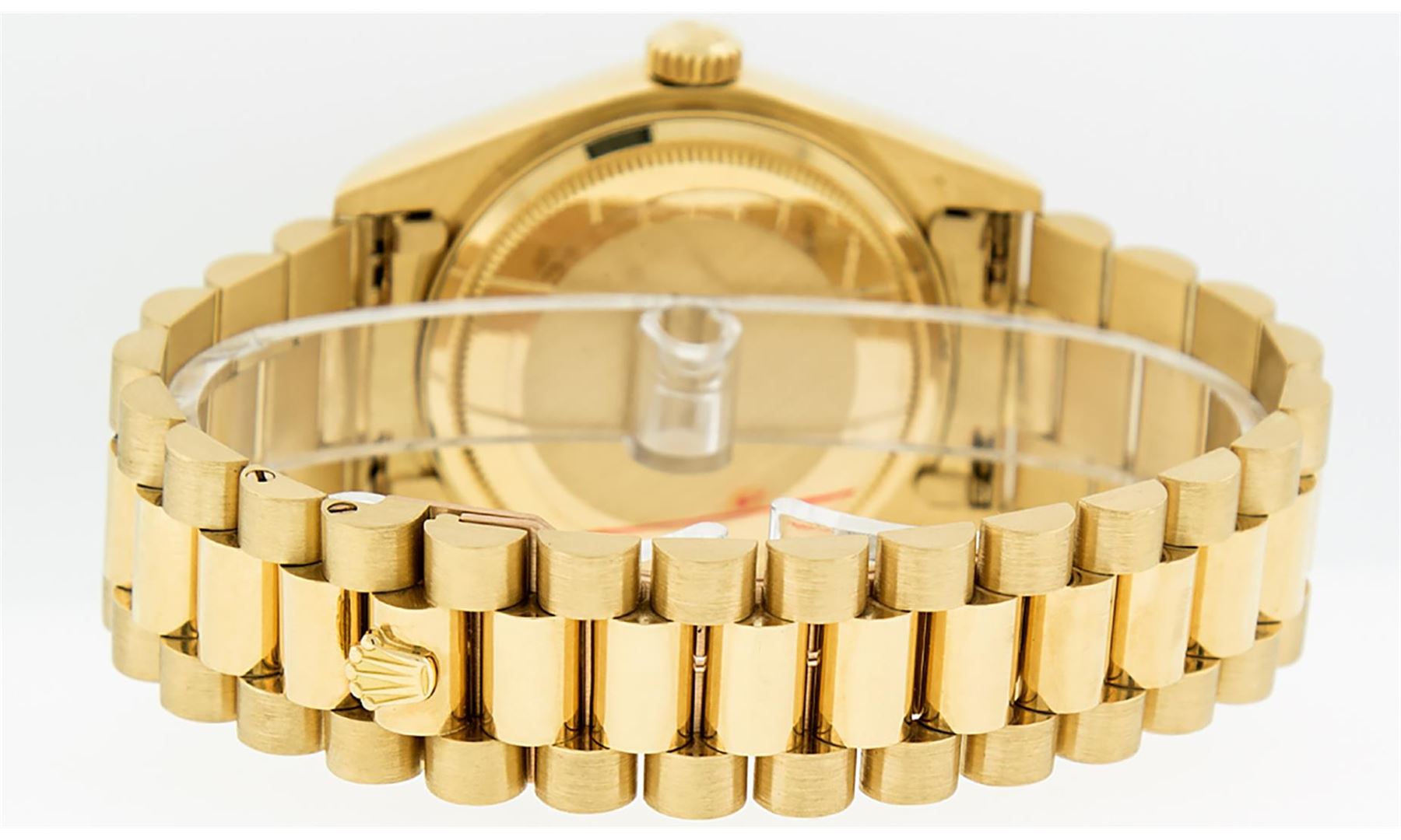 One Mens Quickset Rolex Day Date 18K Yellow Gold President Polished, Serviced & Electronically Tested, Rolex 18K Yellow Gold Case: 36mm, Rolex 18K Yellow Gold Crown, Rolex Bezel: 18K Yellow Gold Fluted Bezel. Crystal: Sapphire With Magnified Date Window. Hands: Luminescent Hands. Rolex Movement: Automatic Quickset Winding Movement Caliber 3055. Rolex Dial: Champagne Index With Roman Track & Lumi Dots. Date Window: 3 O'Clock Position, Day Display: 12 O'Clock Position, Single Quickset, Model: Day Date Quickset President. Condition: G-6 Extra Fine. Rolex Bracelet: 18K Yellow Gold President Band With Hidden Clasp, Bright & Satin Polish. 7.0 Inch Length, Standard Hidden President Clasp, With Rolex Logo. This Pre Owned Watch Has Been Serviced Time Tested And Is In Excellent Condition It Is Free Of All Scratches And Dents.