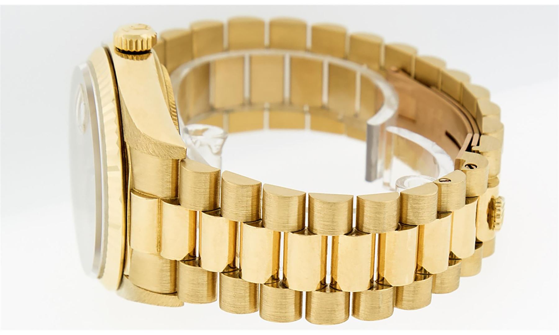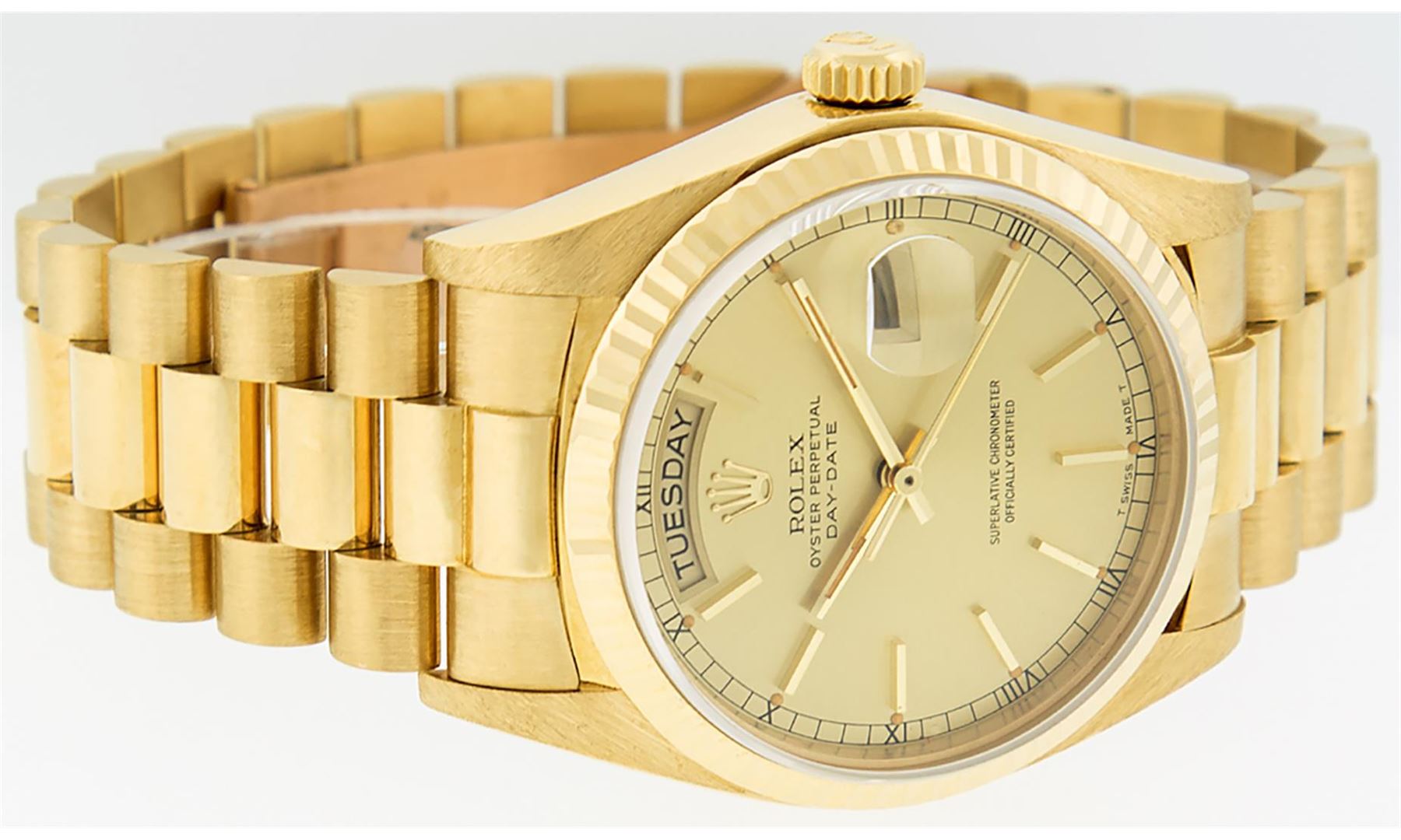 One Mens Quickset Rolex Day Date 18K Yellow Gold President Polished, Serviced & Electronically Tested, Rolex 18K Yellow Gold Case: 36mm, Rolex 18K Yellow Gold Crown, Rolex Bezel: 18K Yellow Gold Fluted Bezel. Crystal: Sapphire With Magnified Date Window. Hands: Luminescent Hands. Rolex Movement: Automatic Quickset Winding Movement Caliber 3055. Rolex Dial: Champagne Index With Roman Track & Lumi Dots. Date Window: 3 O'Clock Position, Day Display: 12 O'Clock Position, Single Quickset, Model: Day Date Quickset President. Condition: G-6 Extra Fine. Rolex Bracelet: 18K Yellow Gold President Band With Hidden Clasp, Bright & Satin Polish. 7.0 Inch Length, Standard Hidden President Clasp, With Rolex Logo. This Pre Owned Watch Has Been Serviced Time Tested And Is In Excellent Condition It Is Free Of All Scratches And Dents.