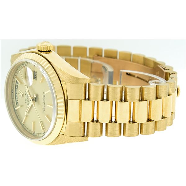 One Mens Quickset Rolex Day Date 18K Yellow Gold President Polished, Serviced & Electronically Tested, Rolex 18K Yellow Gold Case: 36mm, Rolex 18K Yellow Gold Crown, Rolex Bezel: 18K Yellow Gold Fluted Bezel. Crystal: Sapphire With Magnified Date Window. Hands: Luminescent Hands. Rolex Movement: Automatic Quickset Winding Movement Caliber 3055. Rolex Dial: Champagne Index With Roman Track & Lumi Dots. Date Window: 3 O'Clock Position, Day Display: 12 O'Clock Position, Single Quickset, Model: Day Date Quickset President. Condition: G-6 Extra Fine. Rolex Bracelet: 18K Yellow Gold President Band With Hidden Clasp, Bright & Satin Polish. 7.0 Inch Length, Standard Hidden President Clasp, With Rolex Logo. This Pre Owned Watch Has Been Serviced Time Tested And Is In Excellent Condition It Is Free Of All Scratches And Dents.