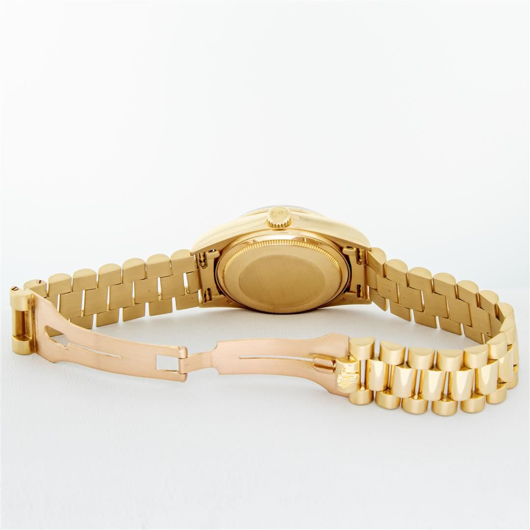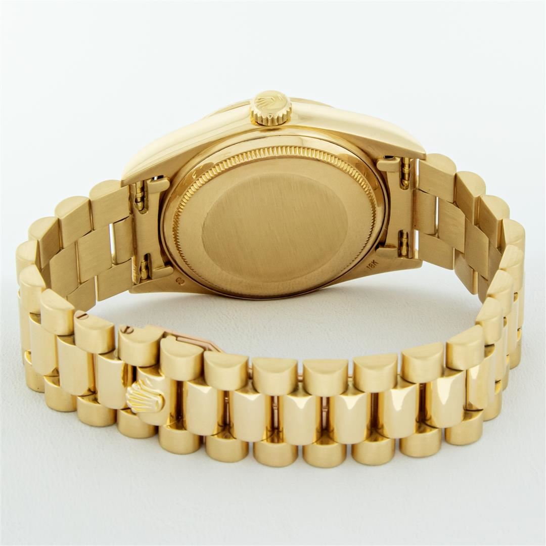 One Mens Quickset Rolex Day Date 18K Yellow Gold President Polished, Serviced & Electronically Tested, Rolex 18K Yellow Gold Case: 36mm, Rolex 18K Yellow Gold Crown, Rolex Bezel: 18K Yellow Gold Fluted Bezel. Crystal: Sapphire With Magnified Date Window. Rolex Movement: Automatic Quickset Winding Movement Caliber 3055. Rolex Dial: Factory Champagne Diamond Dial With Dash Track And Lumi Dots, Stone Count: 8 Diamonds + 2 Baguette Diamonds, Clarity: VS. Date Window: 3 O'Clock Position, Day Display: 12 O'Clock Position, Single Quickset, Model: Day Date Quickset President. Condition: G-6 Extra Fine. Rolex Bracelet: 18K Yellow Gold President Band With Hidden Clasp, Bright & Satin Polish. 7.0 Inch Length, Standard Hidden President Clasp, With Rolex Logo. This Pre Owned Watch Has Been Serviced Time Tested And Is In Excellent Condition It Is Free Of All Scratches And Dents.