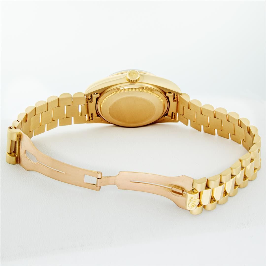 One Mens Quickset Rolex Day Date 18K Yellow Gold President Polished, Serviced & Electronically Tested, Rolex 18K Yellow Gold Case: 36mm, Rolex 18K Yellow Gold Crown, Rolex Bezel: 18K Yellow Gold Fluted Bezel. Crystal: Sapphire With Magnified Date Window. Rolex Movement: Automatic Quickset Winding Movement Caliber 3055. Rolex Dial: Factory Champagne Diamond Dial With Dash Track And Lumi Dots, Stone Count: 8 Diamonds + 2 Baguette Diamonds, Clarity: VS. Date Window: 3 O'Clock Position, Day Display: 12 O'Clock Position, Single Quickset, Model: Day Date Quickset President. Condition: G-6 Extra Fine. Rolex Bracelet: 18K Yellow Gold President Band With Hidden Clasp, Bright & Satin Polish. 7.0 Inch Length, Standard Hidden President Clasp, With Rolex Logo. This Pre Owned Watch Has Been Serviced Time Tested And Is In Excellent Condition It Is Free Of All Scratches And Dents.
