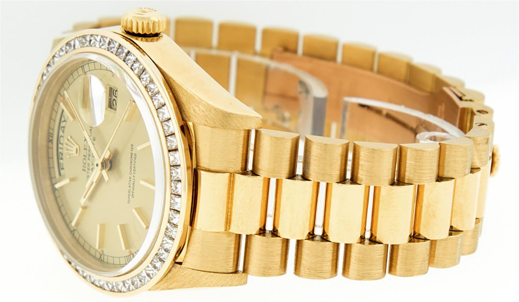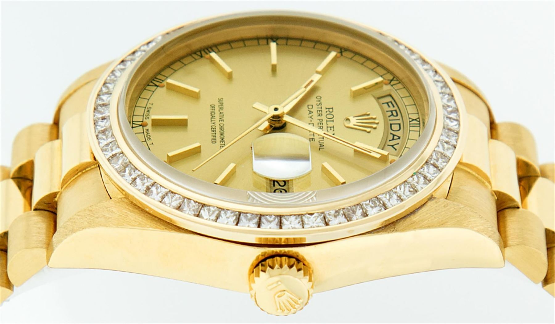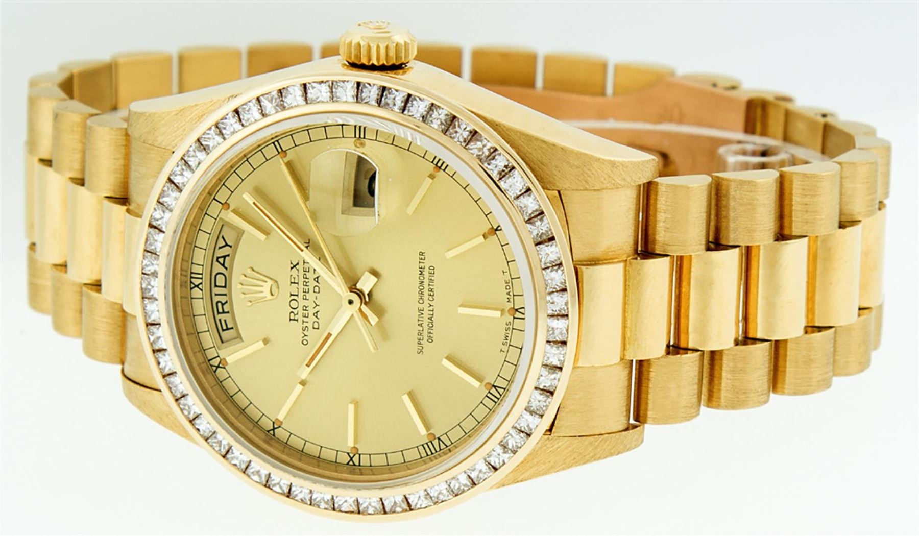 One Mens Rolex Day Date 18K Yellow Gold President Polished, Serviced & Electronically Tested, Rolex 18K Yellow Gold Case: 36mm, Rolex 18K Yellow Gold Crown, Custom Bezel: New 14K Yellow Gold Princess Cut Diamond Bezel, Diamond Count: 53 Diamonds On Bezel. Total Weight 2.75 Carat, Clarity: SI-VS, Color: G to H. Custom Crystal: New Sapphire With Magnified Date Window. Hands: Luminescent Hands. Rolex Movement: Automatic Winding Movement Caliber 3055. Rolex Dial: Champagne Index Dial With Square Roman Track And Lumi Dots. Date Window: 3 O'Clock Position Date Display, Day Window: 12 O'Clock Position Date Display. Quickset, Model: Day Date Quickset President. Condition: G-6 Extra. Rolex Bracelet: 18K Yellow Gold President Band. Bright Polish. 7.0 Inch Length, Standard Hidden President Clasp President Band, With Rolex Logo. This Pre Owned Watch Has Been Serviced Time Tested And Is In Excellent Condition It Is Free Of All Scratches And Dents.