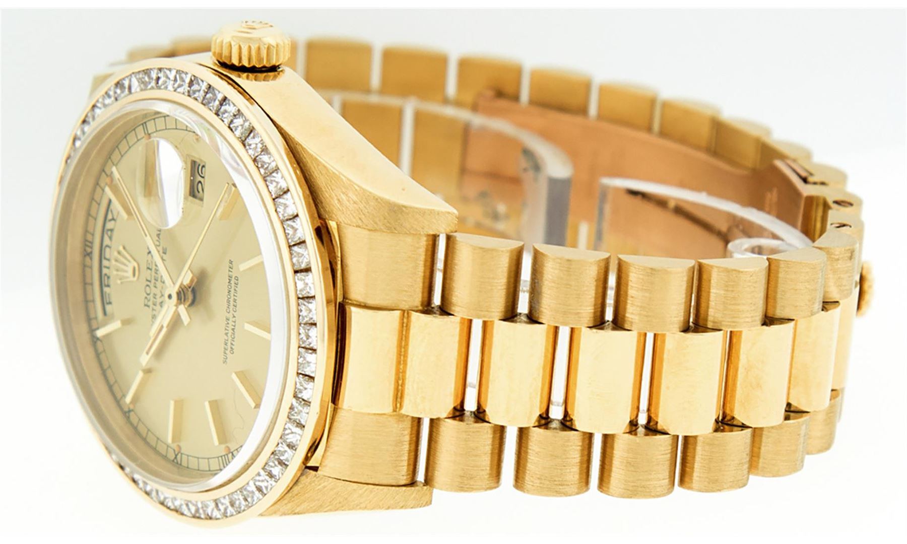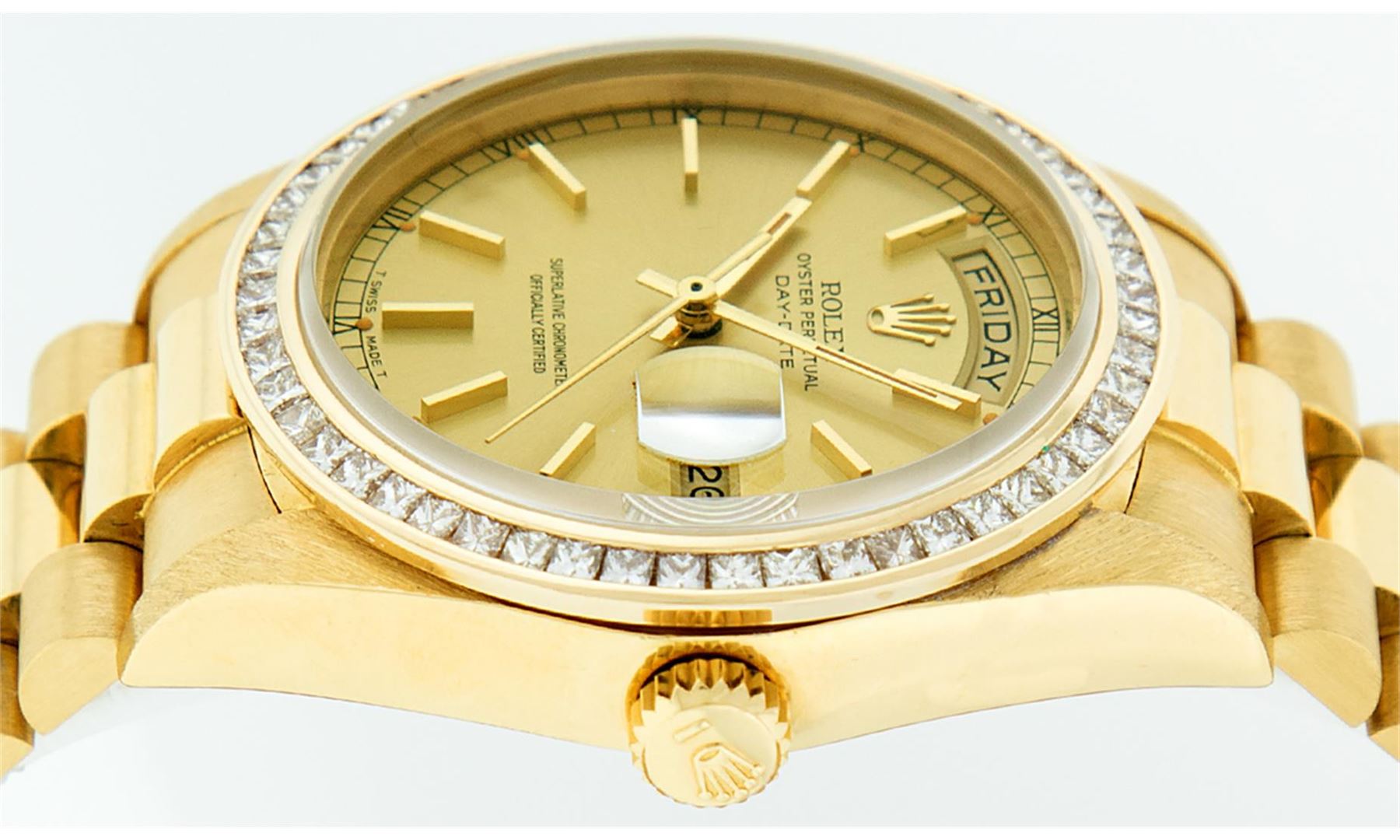 One Mens Rolex Day Date 18K Yellow Gold President Polished, Serviced & Electronically Tested, Rolex 18K Yellow Gold Case: 36mm, Rolex 18K Yellow Gold Crown, Custom Bezel: New 14K Yellow Gold Princess Cut Diamond Bezel, Diamond Count: 53 Diamonds On Bezel. Total Weight 2.75 Carat, Clarity: SI-VS, Color: G to H. Custom Crystal: New Sapphire With Magnified Date Window. Hands: Luminescent Hands. Rolex Movement: Automatic Winding Movement Caliber 3055. Rolex Dial: Champagne Index Dial With Square Roman Track And Lumi Dots. Date Window: 3 O'Clock Position Date Display, Day Window: 12 O'Clock Position Date Display. Quickset, Model: Day Date Quickset President. Condition: G-6 Extra. Rolex Bracelet: 18K Yellow Gold President Band. Bright Polish. 7.0 Inch Length, Standard Hidden President Clasp President Band, With Rolex Logo. This Pre Owned Watch Has Been Serviced Time Tested And Is In Excellent Condition It Is Free Of All Scratches And Dents.