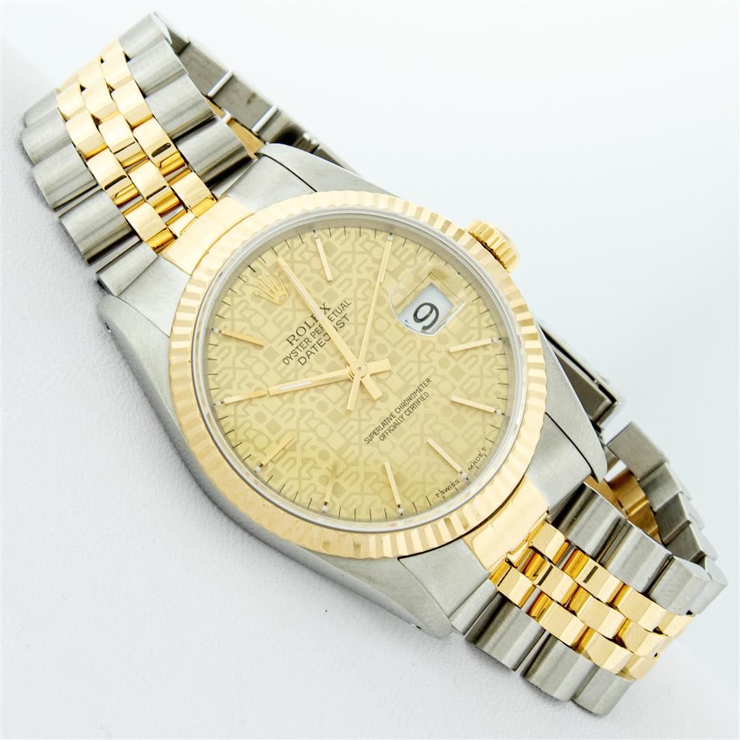 One Mens Rolex Pre Owned Two Tone 14K Yellow Gold And Stainless Steel Datejust Polished, Serviced & Electronically Tested, Yellow Gold & Stainless Steel Case: 36mm, 14K Yellow Gold Crown, Rolex Bezel: 14K Yellow Gold Fluted Bezel. Custom Crystal: New Acrylic With Magnified Date Window. Custom Hands: New Luminescent Hands. Rolex Movement: Automatic Winding Movement 3035. Rolex Dial: Champagne Jubilee Dial With Index Hour Markers and Small Track With Lumi Dots. Date Window: 3 O'Clock Position Date Display, Quickset, Model: Datejust. Condition: G-6 Extra Fine. Rolex Bracelet: Two Tone 14K Yellow Gold & Stainless Steel Jubilee Band. Bright Polish. 7.0 Inch Length, Adjustable. Standard Clasp, With Rolex Logo. This Watch Has Been Serviced Time Tested And Is In Excellent Condition It Is Free Of All Scratches And Dents.