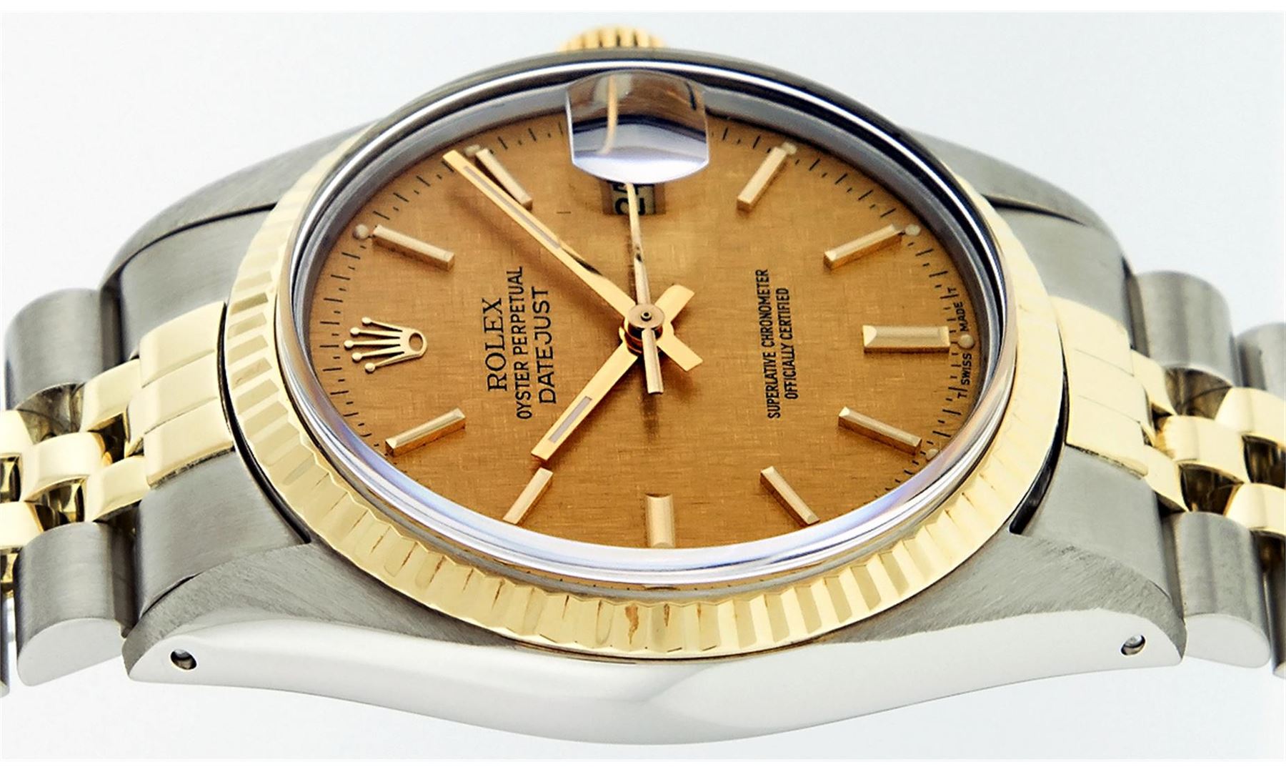 One Mens Pre Owned Quickset Two Tone 14K Yellow Gold And Stainless Steel Datejust Polished, Serviced & Electronically Tested, Yellow Gold & Stainless Steel Case: 36mm, Yellow Gold Crown, Rolex Bezel: 14K Yellow Gold Fluted Bezel. Custom Crystal: New Acrylic With Magnified Date Window. Hands: Luminescent Hands. Rolex Movement: Automatic Winding Movement 3035. Rolex Dial: Champagne Linen Dial With Index Hour Markers and Small Track With Lumi Dots. Date Window: 3 O'Clock Position Date Display, Quickset, Model: Datejust. Condition: G-6 Extra Fine. Rolex Bracelet: Two Tone 14K Yellow Gold & Stainless Steel Jubilee Band. Bright Polish. 7.0 Inch Length, Adjustable. Standard Clasp, With Rolex Logo. This Watch Has Been Serviced Time Tested And Is In Excellent Condition It Is Free Of All Scratches And Dents.