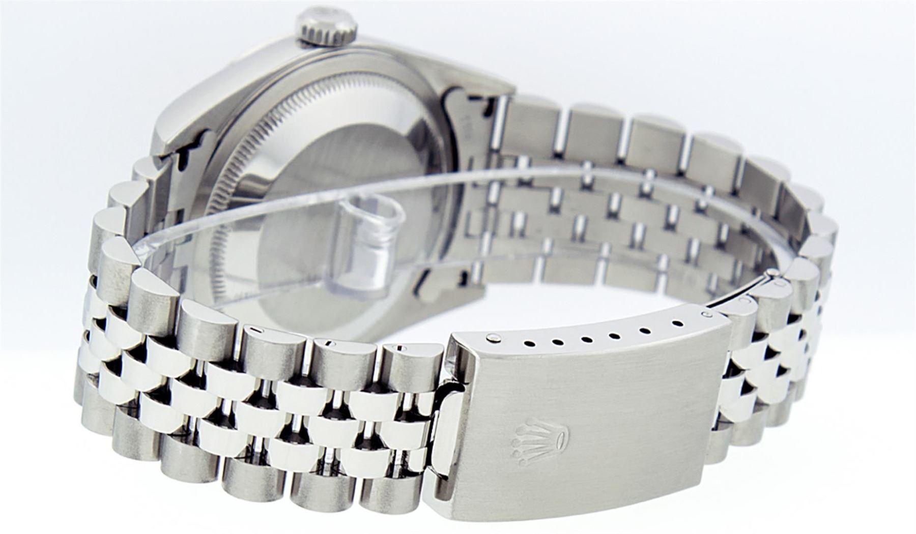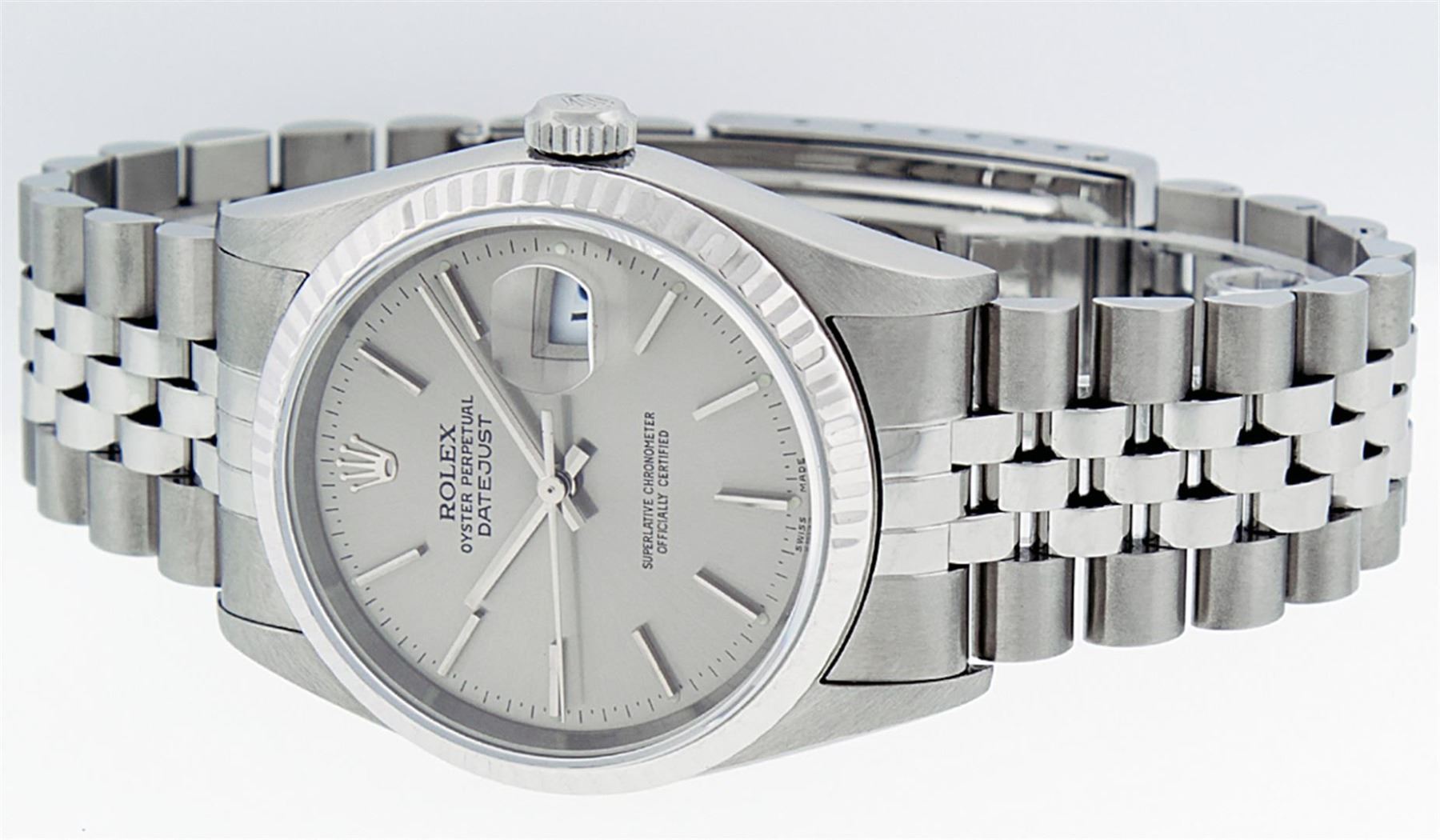 One Mens Rolex Quickset Stainless Steel Datejust Polished Bright with Satin Finish, Serviced & Electronically Tested, Rolex Stainless Steel Case: 36mm, Rolex Stainless Steel Crown, Rolex Bezel: 14K White Gold Fluted Bezel. Crystal: Sapphire With Magnified Date Window. Hands: Solid Hands. Rolex Movement: Automatic Winding Movement Caliber 3135. Custom Dial: Refinished To Gray With Index Hour Markers Dash Track And Lumi Dots. Date Window: 3 O'Clock Position Date Display, Quickset, Model: Quickset Datejust. Condition: G-6 Extra Fine. Rolex Bracelet: Stainless Steel Jubilee Band. Bright Polish & Satin Finish. 7.0 Inch Length, Adjustable. Standard Clasp, With Rolex Logo. This Pre Owned Watch Has Been Serviced Time Tested And Is In Excellent Condition It Is Free Of All Scratches And Dents.