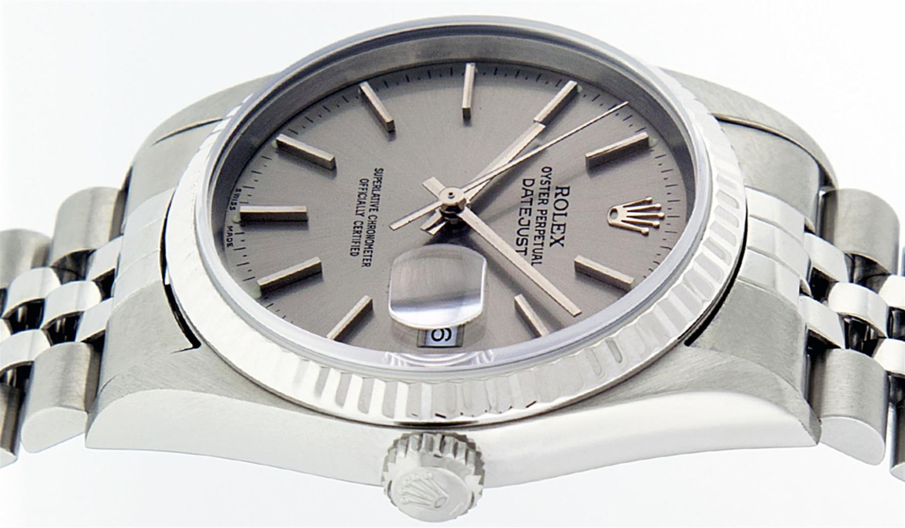 One Mens Rolex Quickset Stainless Steel Datejust Polished Bright with Satin Finish, Serviced & Electronically Tested, Rolex Stainless Steel Case: 36mm, Rolex Stainless Steel Crown, Rolex Bezel: 14K White Gold Fluted Bezel. Crystal: Sapphire With Magnified Date Window. Hands: Solid Hands. Rolex Movement: Automatic Winding Movement Caliber 3135. Custom Dial: Refinished To Gray With Index Hour Markers Dash Track And Lumi Dots. Date Window: 3 O'Clock Position Date Display, Quickset, Model: Quickset Datejust. Condition: G-6 Extra Fine. Rolex Bracelet: Stainless Steel Jubilee Band. Bright Polish & Satin Finish. 7.0 Inch Length, Adjustable. Standard Clasp, With Rolex Logo. This Pre Owned Watch Has Been Serviced Time Tested And Is In Excellent Condition It Is Free Of All Scratches And Dents.