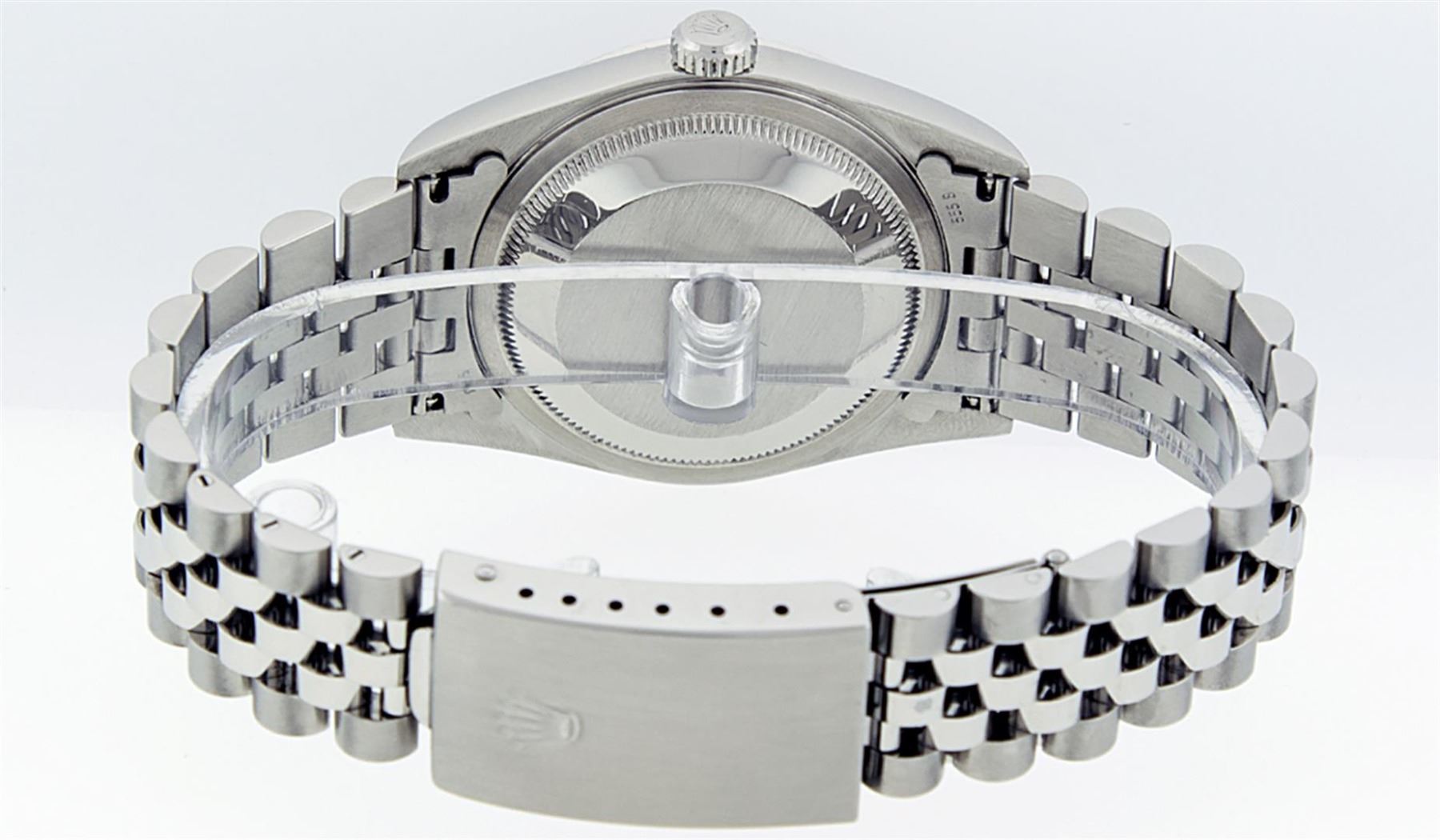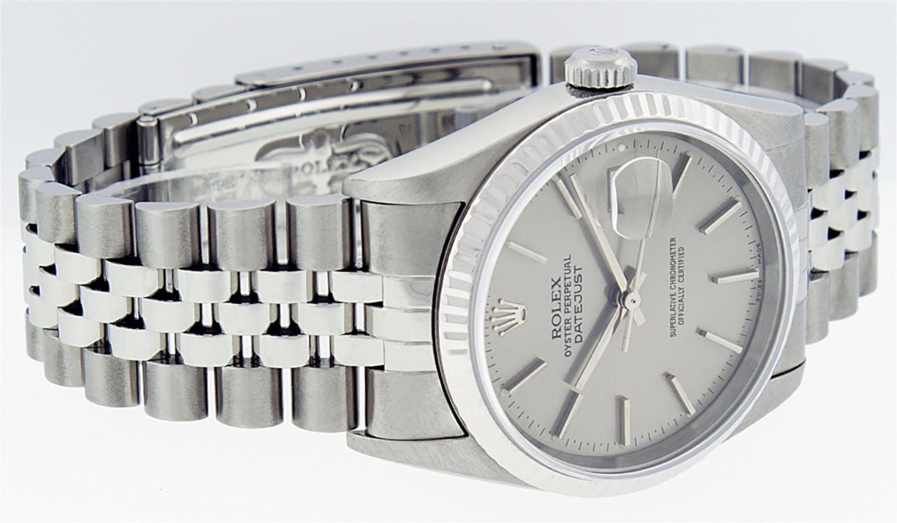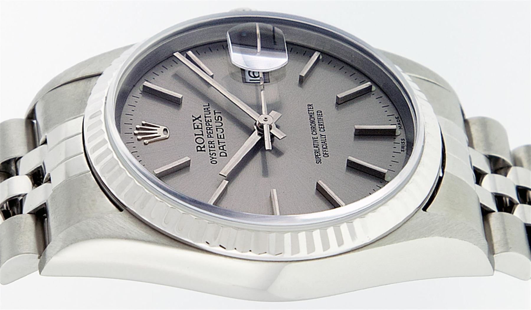 One Mens Rolex Quickset Stainless Steel Datejust Polished Bright with Satin Finish, Serviced & Electronically Tested, Rolex Stainless Steel Case: 36mm, Rolex Stainless Steel Crown, Rolex Bezel: 14K White Gold Fluted Bezel. Crystal: Sapphire With Magnified Date Window. Hands: Solid Hands. Rolex Movement: Automatic Winding Movement Caliber 3135. Custom Dial: Refinished To Gray With Index Hour Markers Dash Track And Lumi Dots. Date Window: 3 O'Clock Position Date Display, Quickset, Model: Quickset Datejust. Condition: G-6 Extra Fine. Rolex Bracelet: Stainless Steel Jubilee Band. Bright Polish & Satin Finish. 7.0 Inch Length, Adjustable. Standard Clasp, With Rolex Logo. This Pre Owned Watch Has Been Serviced Time Tested And Is In Excellent Condition It Is Free Of All Scratches And Dents.