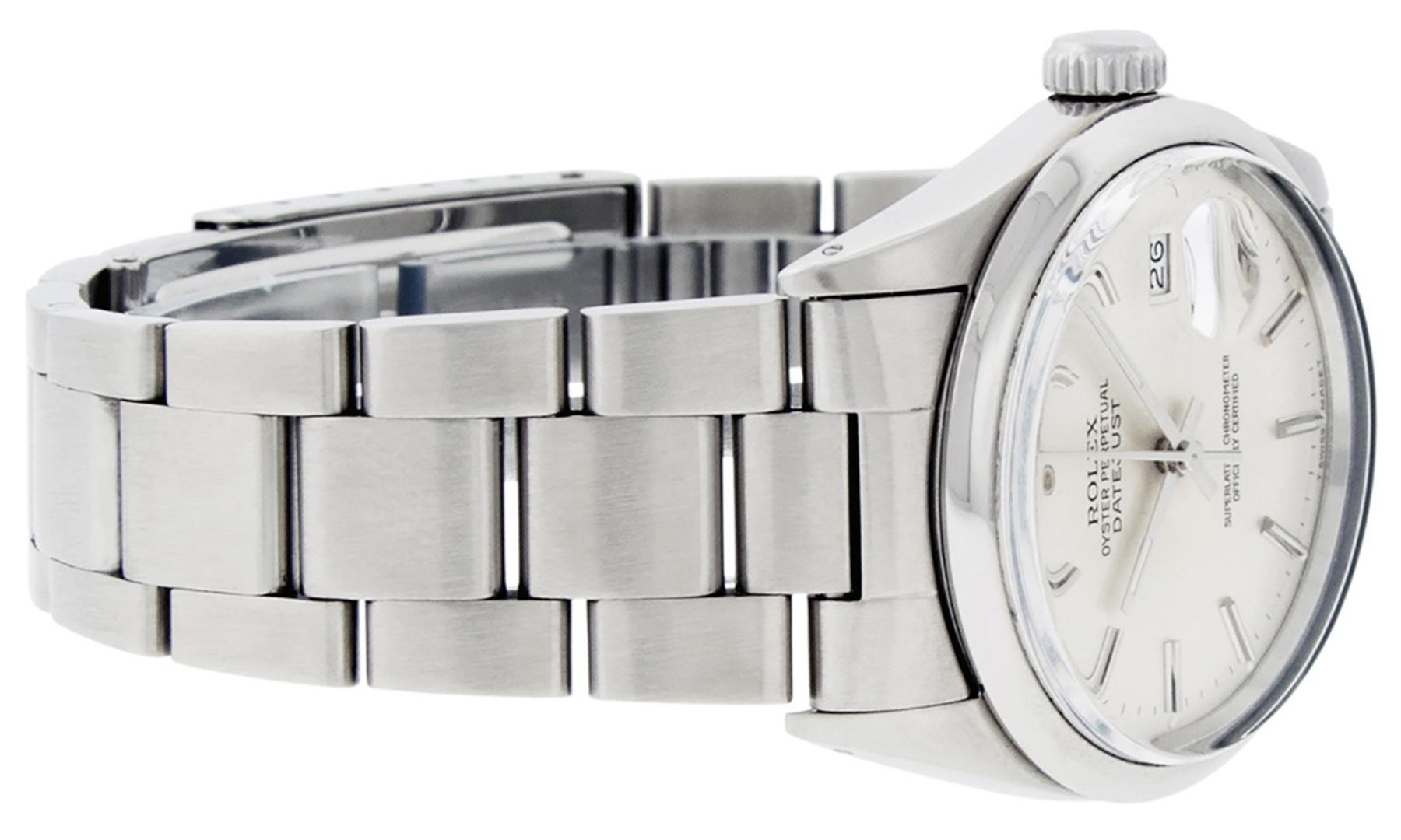 One Mens Rolex Quickset Stainless Steel Datejust Polished Bright with Satin Finish, Serviced & Electronically Tested, Rolex Stainless Steel Case: 36mm, Rolex Stainless Steel Crown, Rolex Bezel: Stainless Steel Smooth Bezel. Crystal: Sapphire With Magnified Date Window. Custom Hands: New Luminescent Hands. Rolex Movement: Automatic Winding Movement Caliber 3135. Rolex Dial: Silver Dial With Index Hour Markers Dash Track And Lumi Dots. Date Window: 3 O'Clock Position Date Display, Quickset, Model: Quickset Datejust. Condition: G-6 Extra Fine. Rolex Bracelet: Stainless Steel Oyster Band. Bright Polish & Satin Finish. 7.0 Inch Length, Adjustable. Standard Clasp, With Rolex Logo. This Pre Owned Watch Has Been Serviced Time Tested And Is In Excellent Condition It Is Free Of All Scratches And Dents.